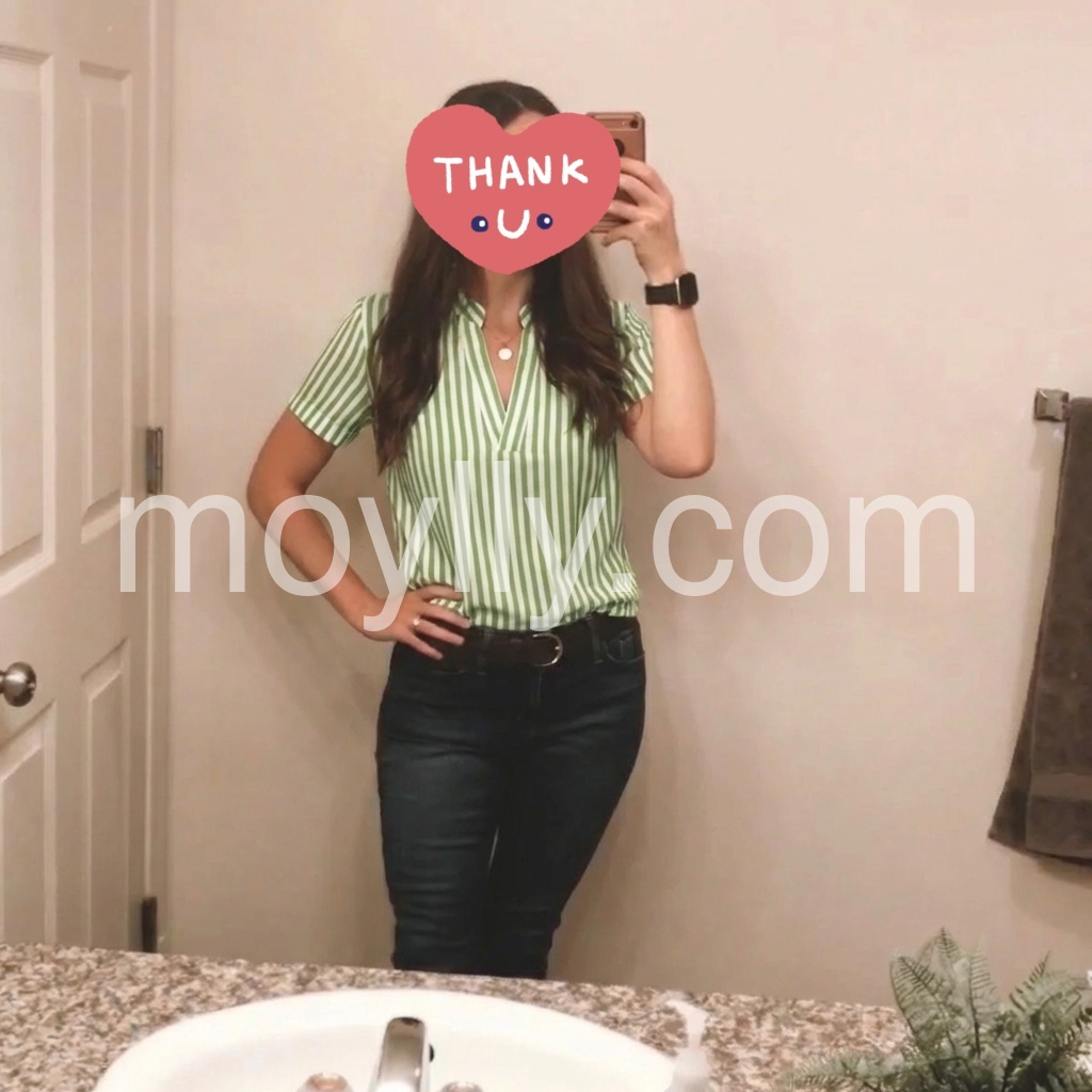 I absolutely love this top! The green and white stripes are so fresh and perfect for spring and summer. The V-neck is flattering but not too revealing for work. It pairs perfectly with my favorite jeans.