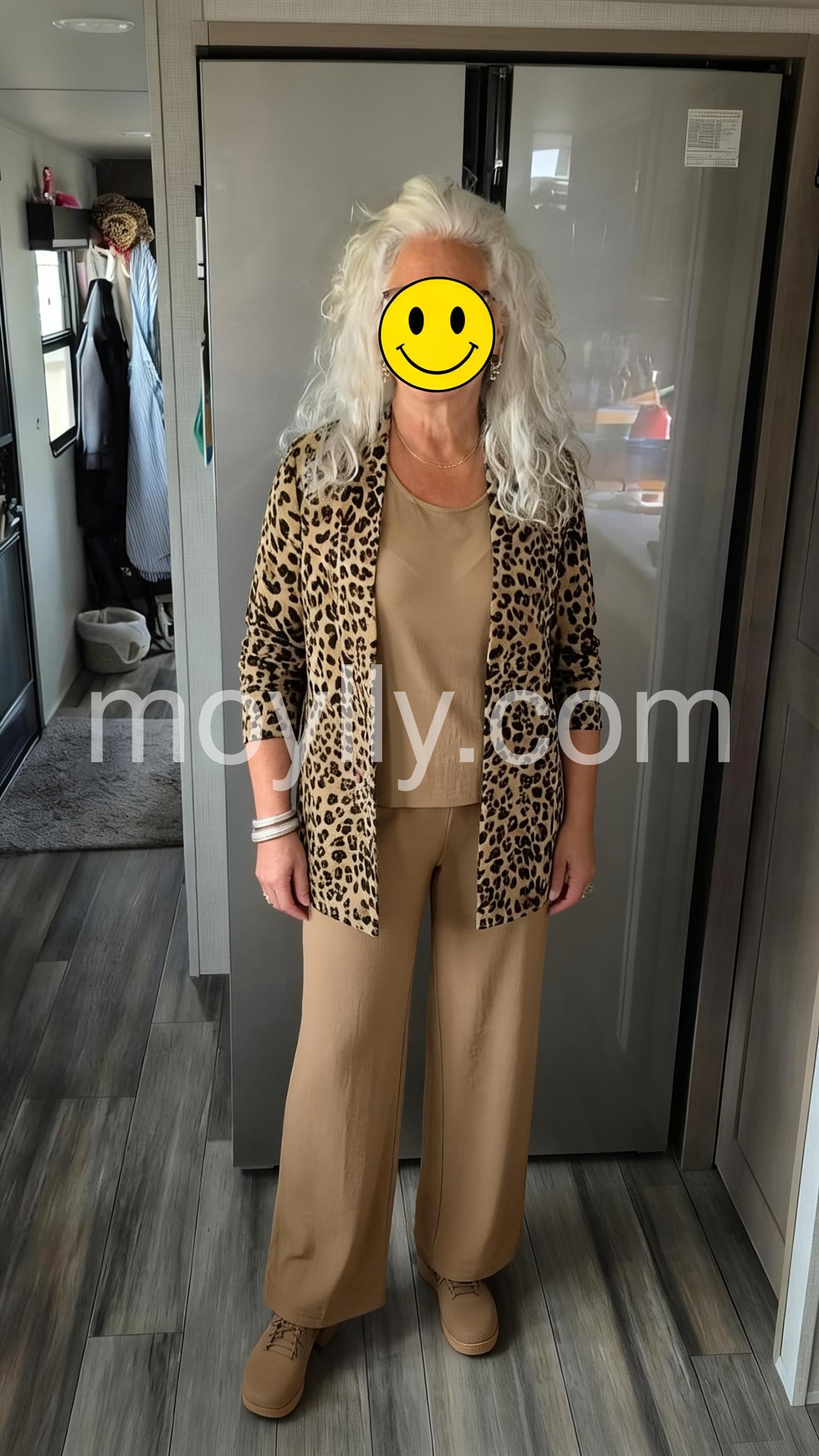 This two-piece set is an absolute staple now. The neutral tone matches everything, and the pop of animal print gives it great personality. Washes beautifully on the delicate cycle. I let it air dry and it looks brand new.