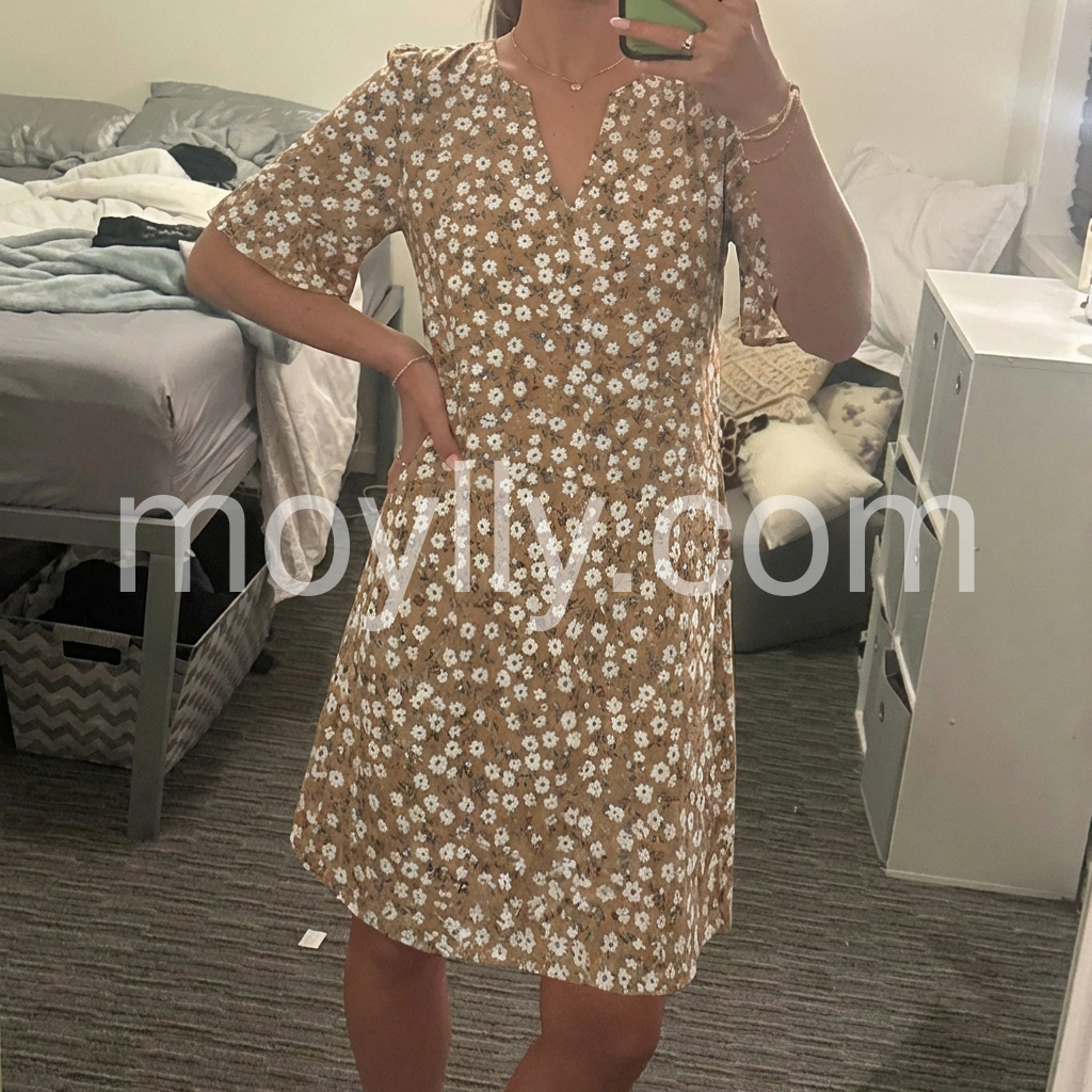 Love this dress! The little white flowers on the tan background are so cute for spring. It fits perfectly and is incredibly comfortable.