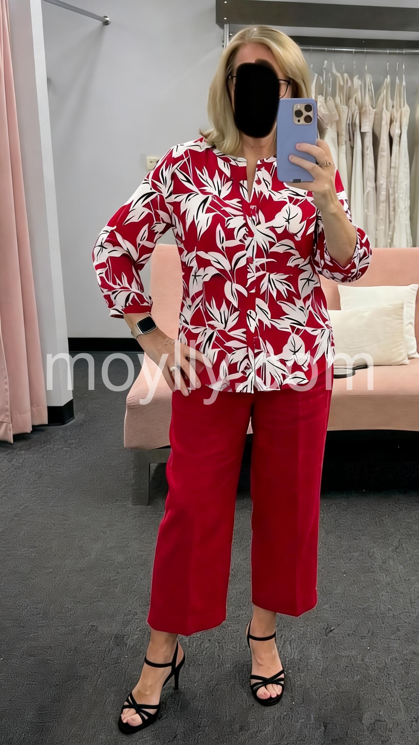 I bought this two-piece set for an upcoming cruise and it is absolutely perfect. The vibrant red color and the white leaf print look so tropical and chic. The fabric is lightweight and breathable, making it ideal for warm weather. Plus, the cropped pants have a very comfortable fit. I received so many compliments when I wore it!