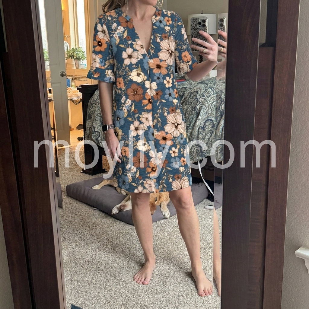 Finally a dress that is both cute and comfortable. The length is exactly what I wanted, not too short but still youthful. The floral design is very trendy right now. I have washed it twice already and the colors have not faded at all. Definitely a wardrobe staple.