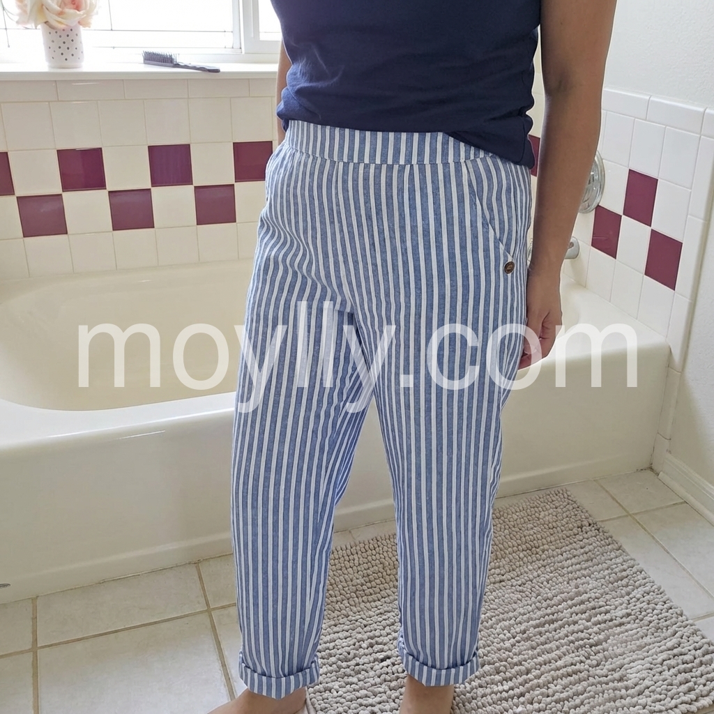 Absolutely love these pants! I took them on my beach vacation and they were perfect. The material is so lightweight and breathable, and the blue and white stripes give off a great nautical vibe. They fit true to size and the pockets are a huge plus!