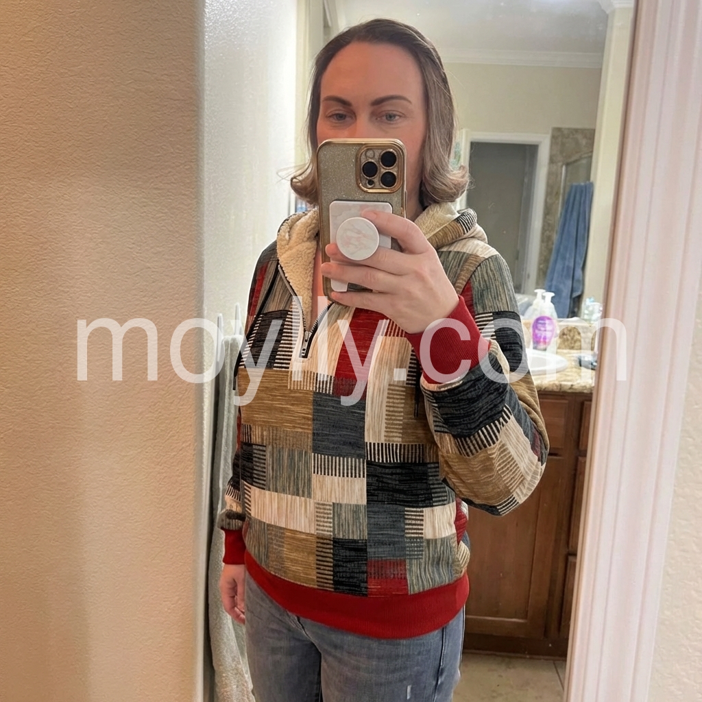 I bought this zip-up top for a casual weekend look, and it exceeded my expectations. The patchwork-style design is unique and modern, and the colors are well-balanced rather than overwhelming. The collar adds that cozy touch, and the overall construction feels solid. It’s easy to pair with jeans or leggings, and it looks great in every lighting situation.