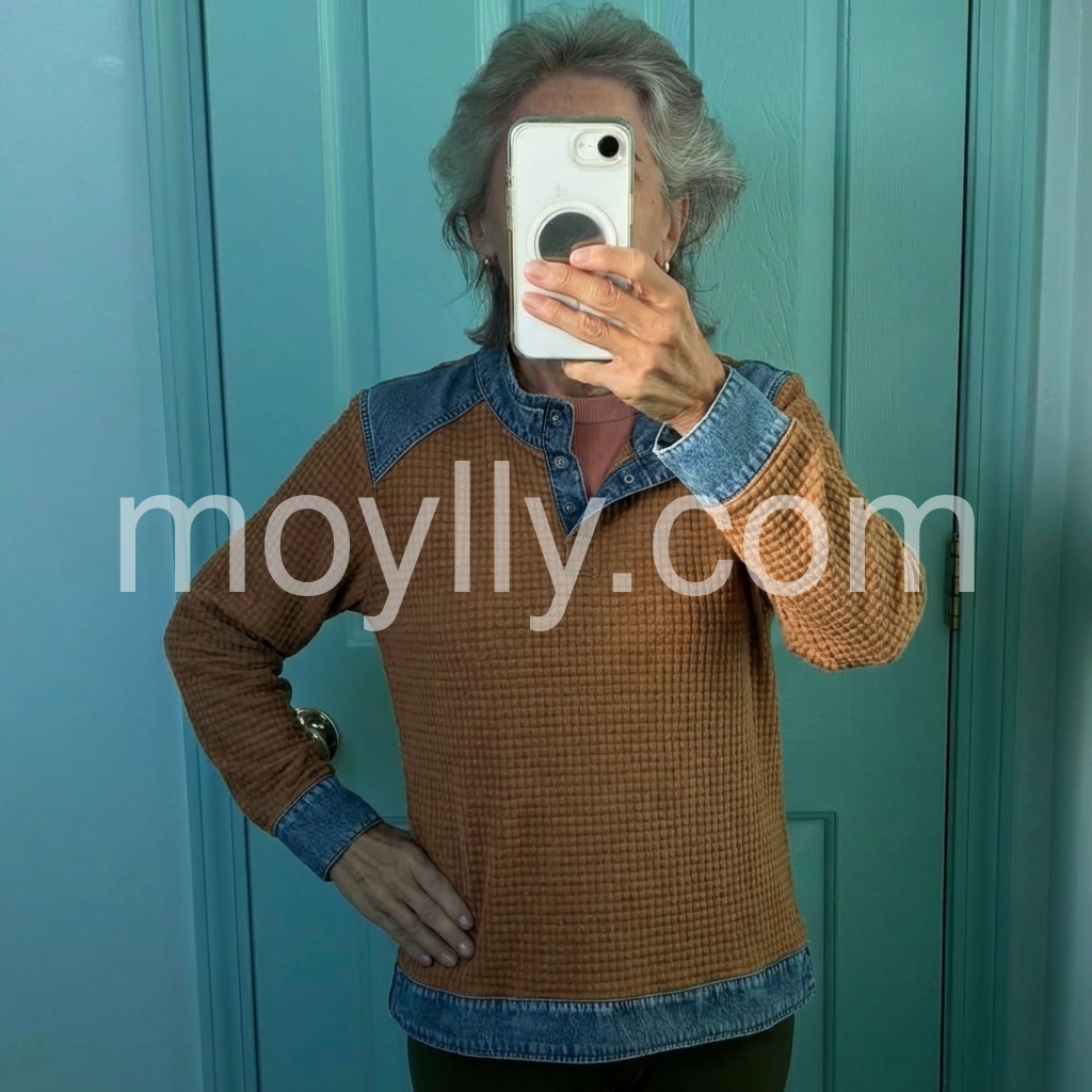 I’m really impressed with this top. The waffle pattern gives it a unique look, and the denim contrast makes it stand out in a good way. I also like that it’s easy to match with different outfits—perfect for someone who wants both style and comfort.