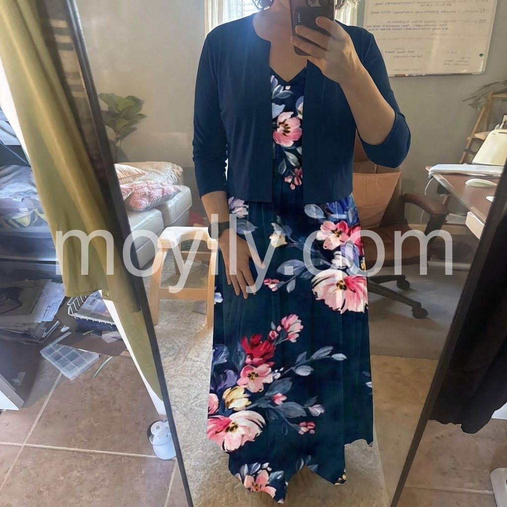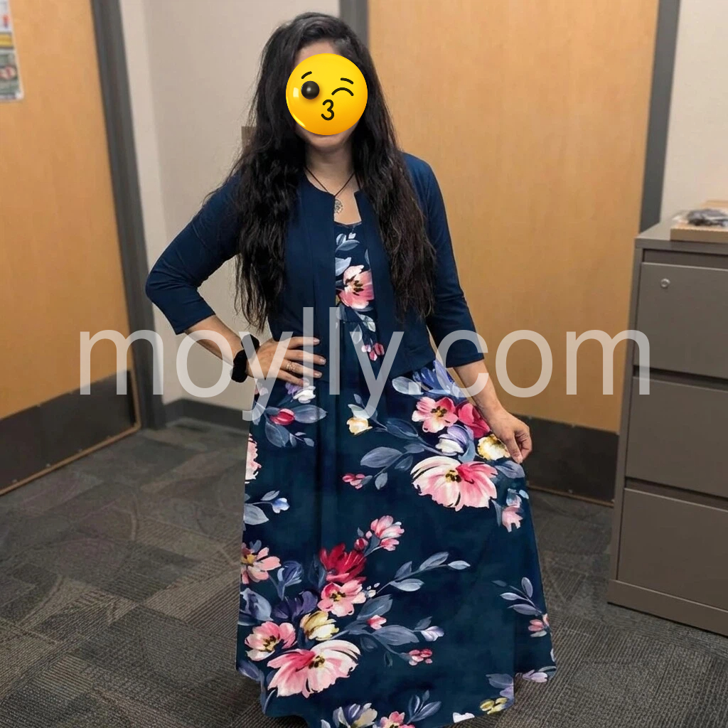 I’m absolutely in love with this dress. So elegant and flattering. The navy base with the vibrant floral print looks rich and eye-catching, and the fit feels just right for everyday wear.