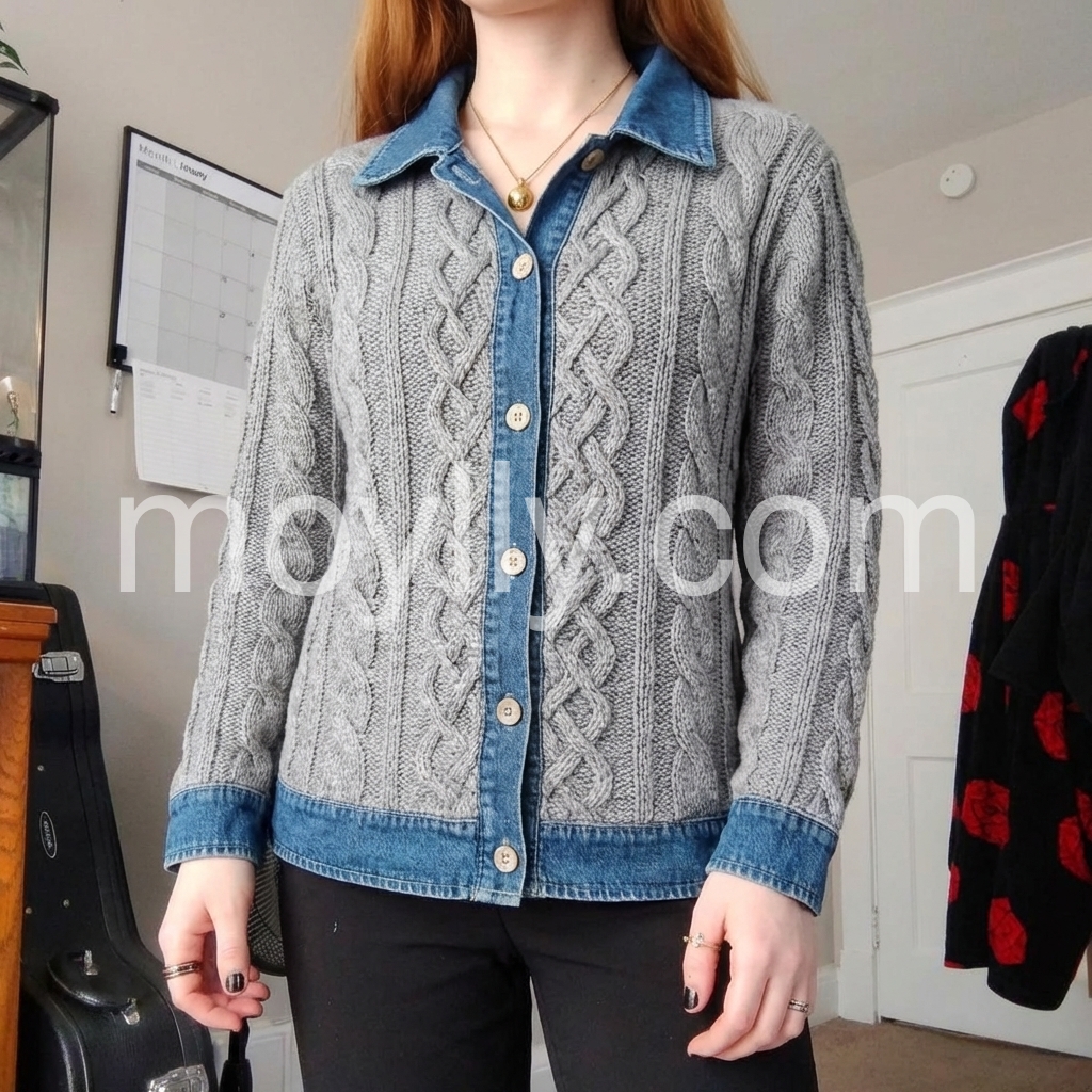 This top is such a great blend of comfy and fashionable. The light gray knit is soft-looking and the braided cable pattern gives it a premium feel. I also really like how the blue denim border stands out—it's flattering and adds personality without being too loud. Overall, it’s a perfect piece for everyday outfits.