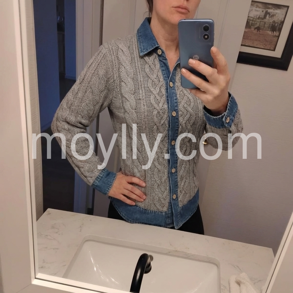 I’m really happy with this purchase. The knit texture is thick enough to feel warm, and the buttons add a classic touch. What I love most is the contrast between the gray sweater body and the blue denim neckline—it makes the top look more layered and fashionable. It’s become one of my go-to pieces.