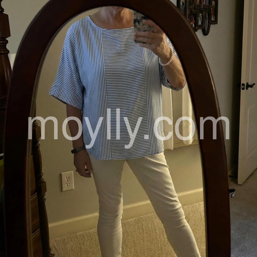 I absolutely love the mixed stripe design on this blouse! The horizontal stripes down the middle and vertical on the sides create such a flattering optical illusion. It is super lightweight and perfect for warm weather. Fits true to size with a nice, relaxed drape.
