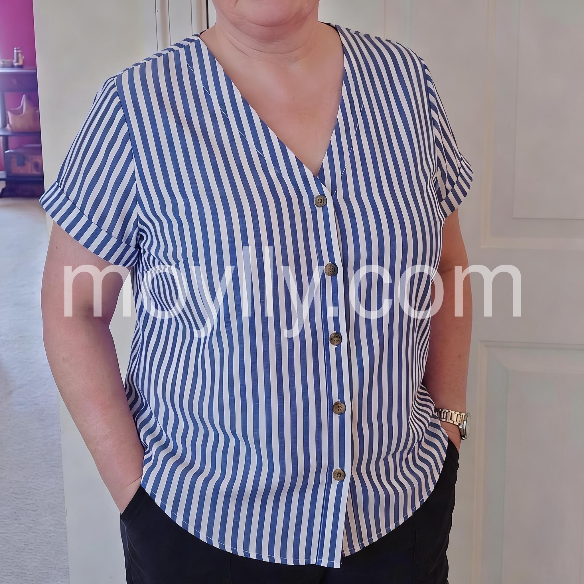 This V-neck top features vertical blue and white stripes with a front button closure. Rolled short sleeves add a relaxed, breezy touch. Lightweight fabric perfect for warm days. Pair with jeans or shorts for a timeless look. Effortlessly chic and easy to style.