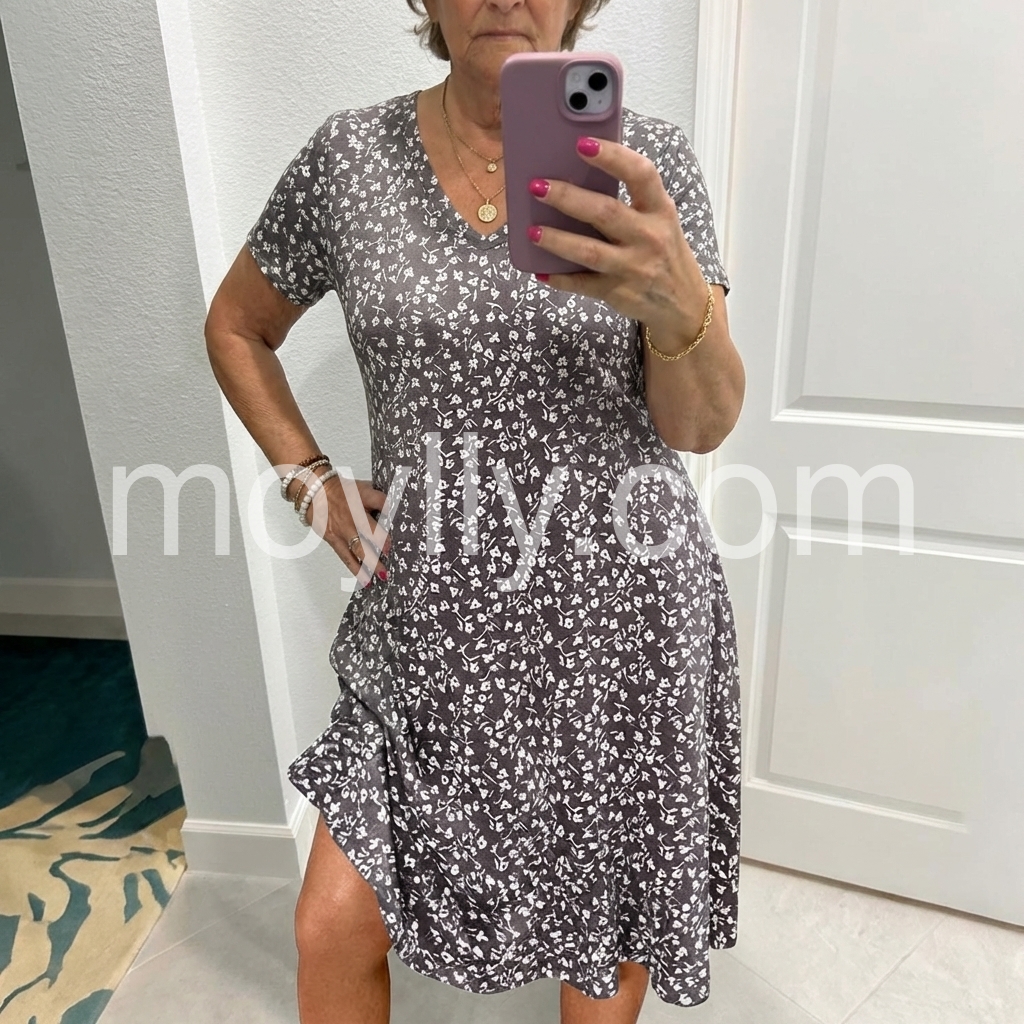 This is my new favorite everyday dress. The dark grey floral print is so pretty in person. It feels like a high-quality lightweight jersey material that breathes well in the heat. Highly recommend!