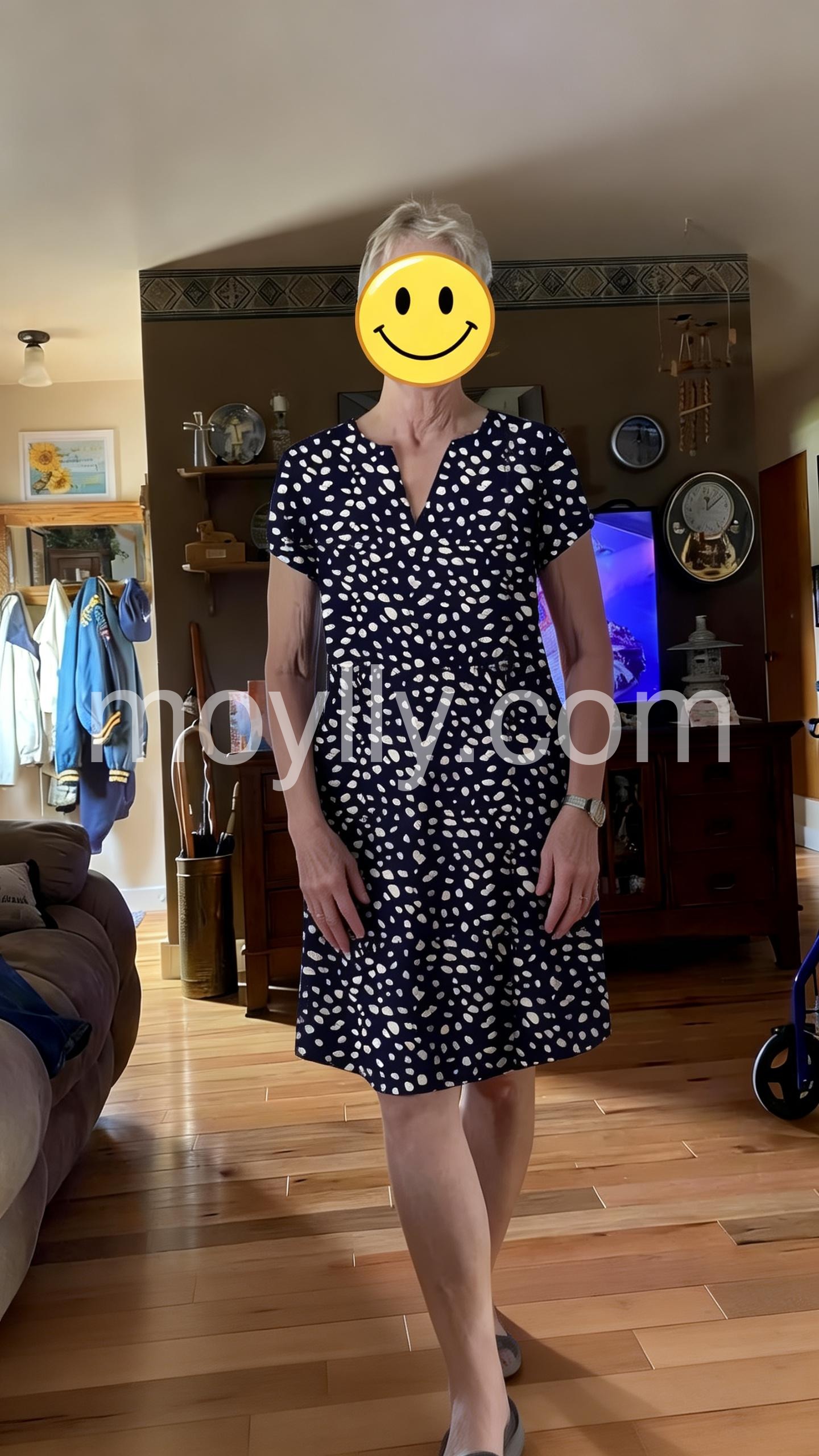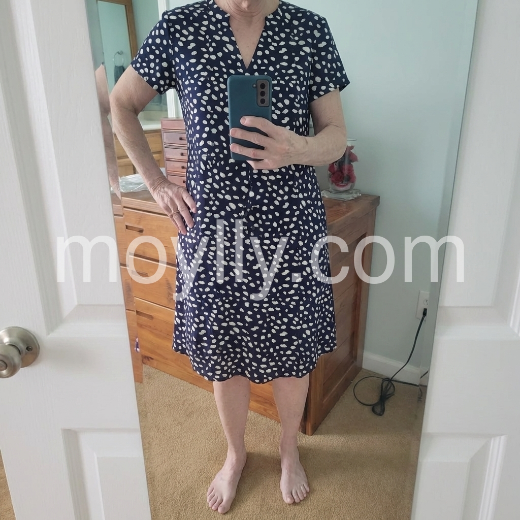 I absolutely love this dress! The fit is incredibly flattering and forgiving, especially around the midsection. The material is lightweight and perfect for summer weather. I wore it to a lovely outdoor brunch and received so many compliments on the fun spotty print. It hits right at the knee for me, which is exactly what I wanted.