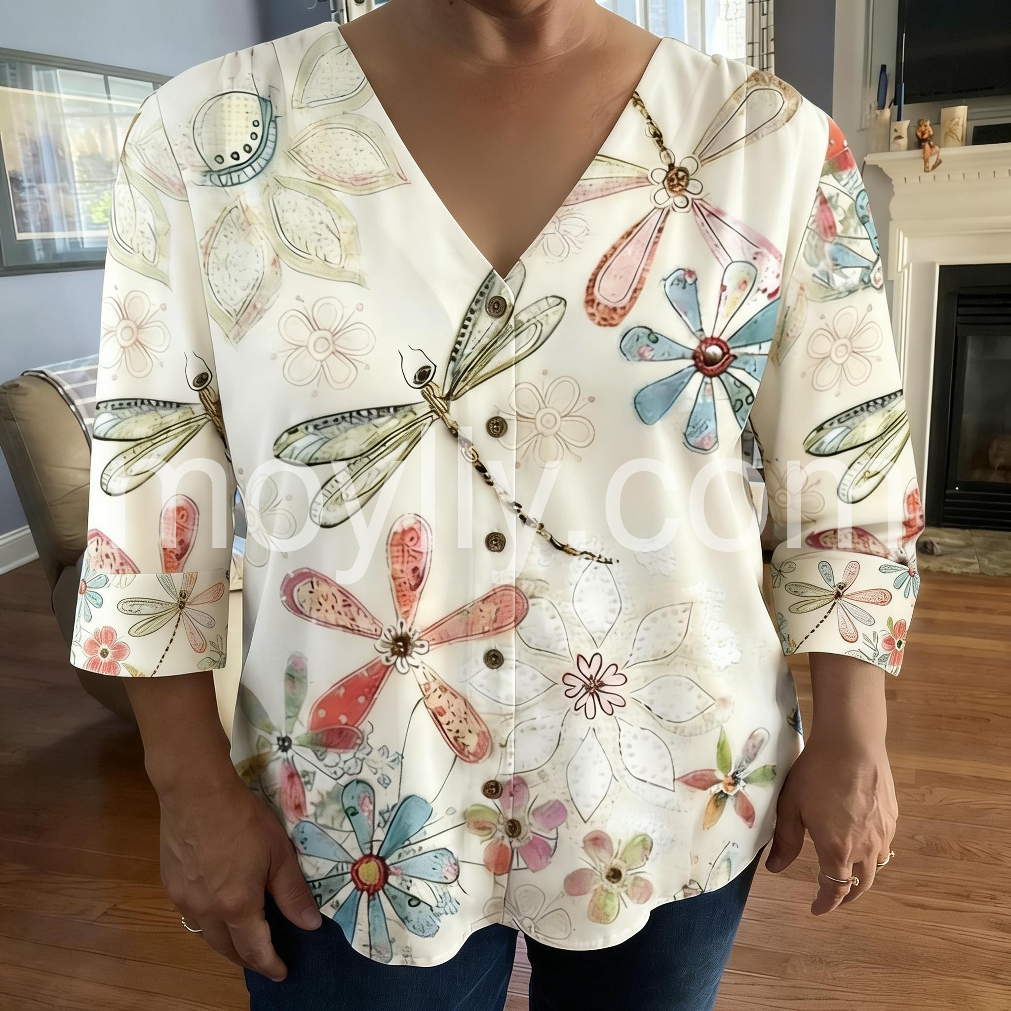 This V-neck top features a vibrant floral and dragonfly print on a soft cream base. Front button closure with rolled three-quarter sleeves. Lightweight fabric perfect for warm days. Relaxed fit with a playful, artistic touch. Ideal for casual outings or beachwear.