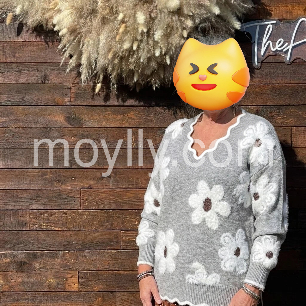 I’m really impressed with how well this sweater drapes and how comfortable it feels. The V-neck adds a subtle, flattering shape, and the sleeves sit nicely without feeling tight. The grey base color makes the whole print look extra vivid. I’ve worn it with my denim and it looks effortless—like I tried to style it, but without any effort. Definitely a go-to piece for cooler weather.