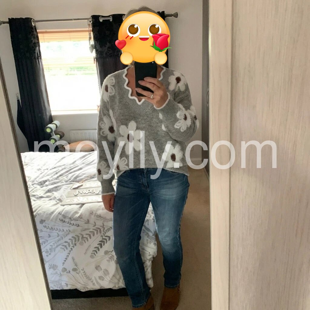Wearing this sweater instantly makes my outfit feel special. The V-neck is flattering and gives a nice line to the chest area, and the knit fabric feels soft and cozy to the touch. The cute printed details (those little flowers and characters) are super eye-catching, with a balanced placement that doesn’t look crowded. I also love how it pairs effortlessly with jeans—the fit is comfortable, and it’s perfect for casual days when you still want to look put together.