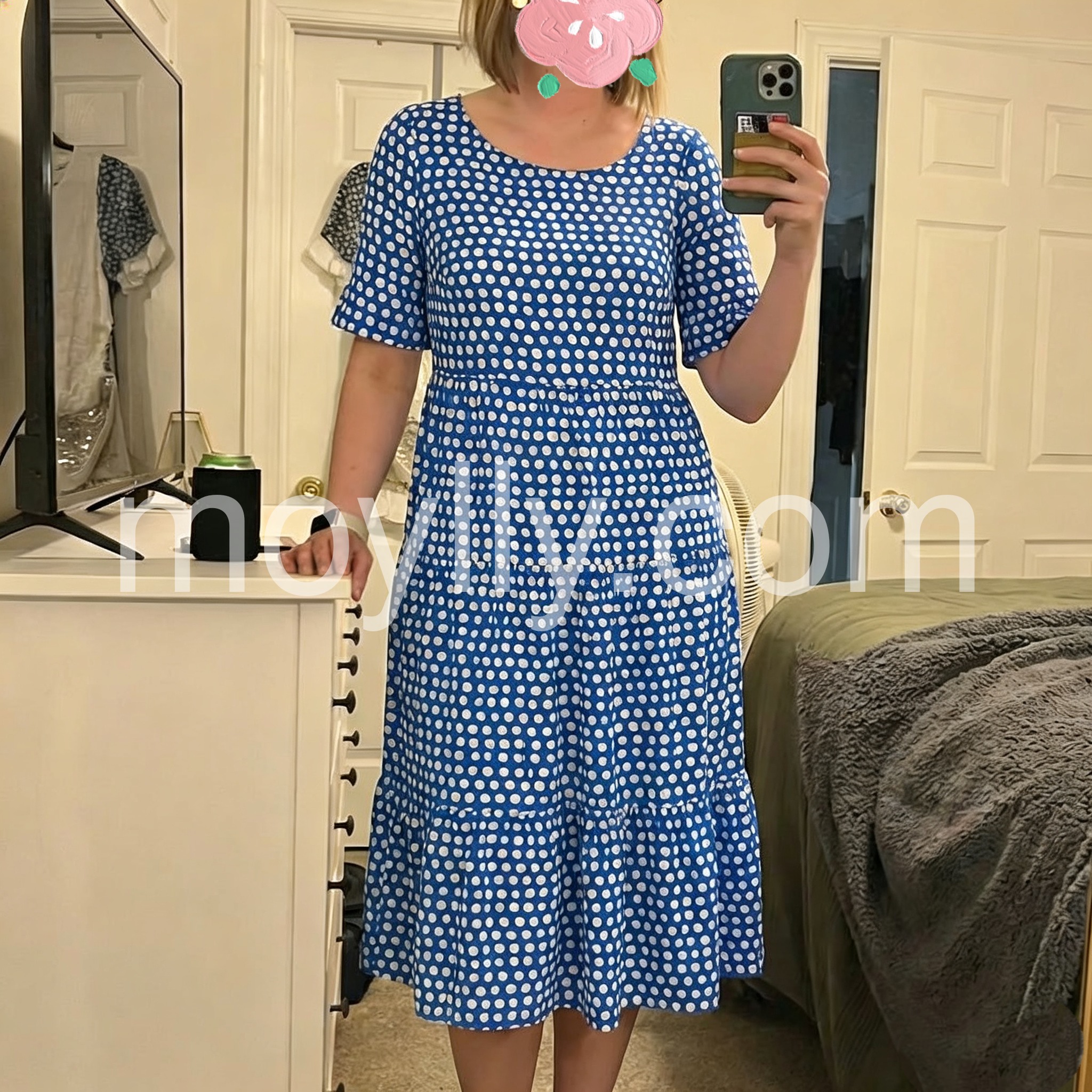 Blue Polka Dot Tiered Midi Dress with Ruffle Sleeves