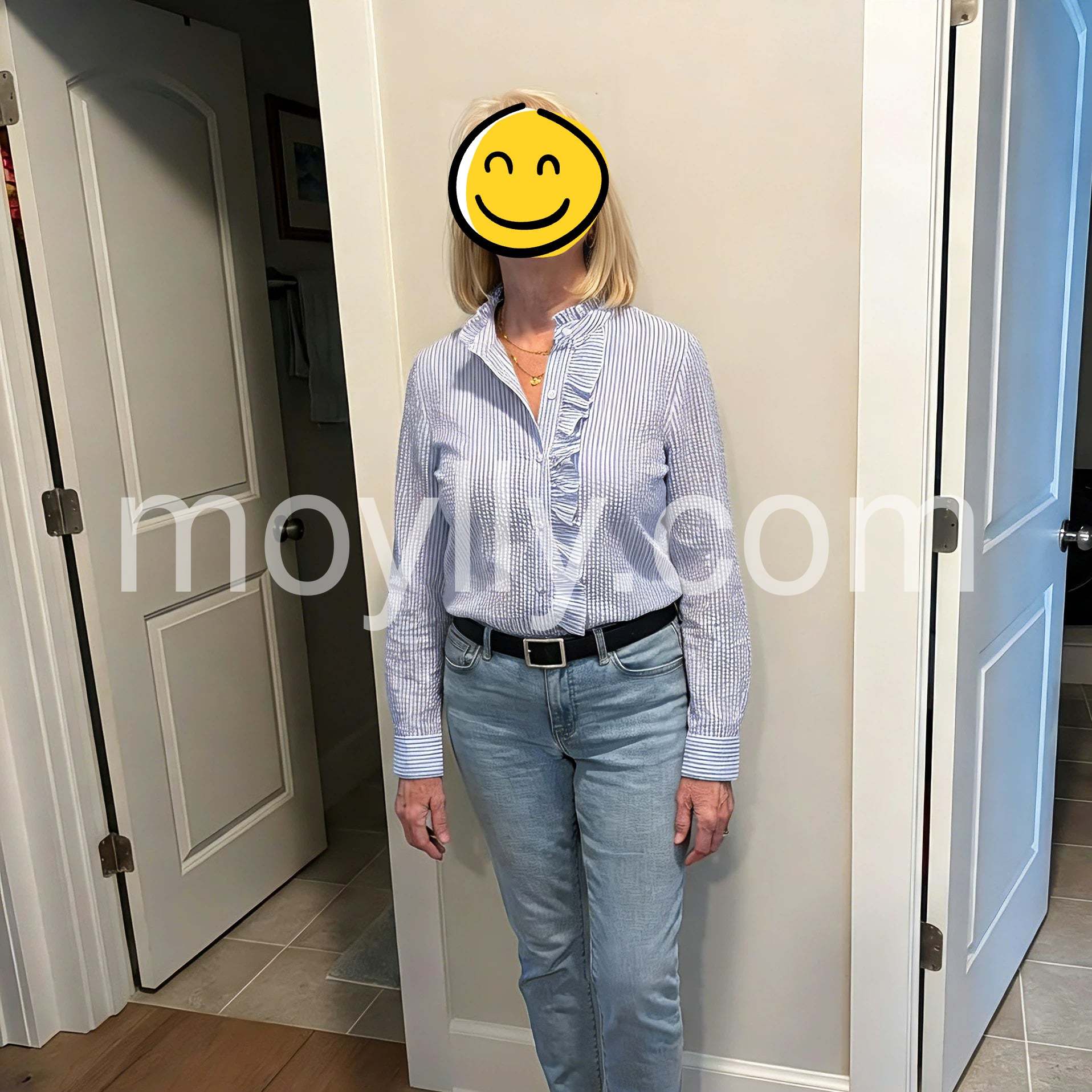 The blouse has a timeless appeal with a fresh twist. The ruffled front adds texture without overpowering the simple stripe pattern. I styled it with light-washed jeans and a slim belt for a relaxed, fashion-forward weekend look. The long sleeves can be rolled up easily, making it adaptable for both cooler mornings and warmer afternoons.