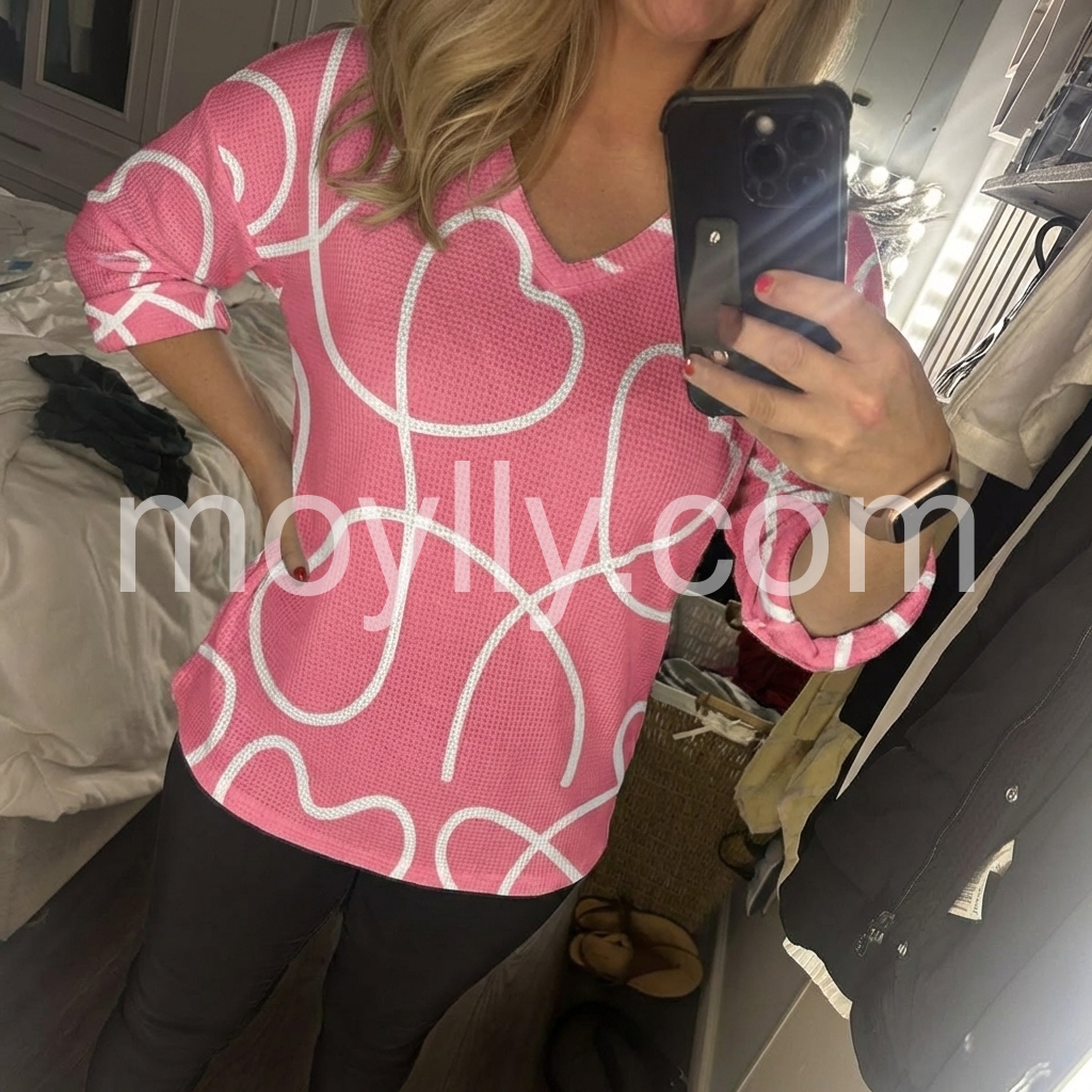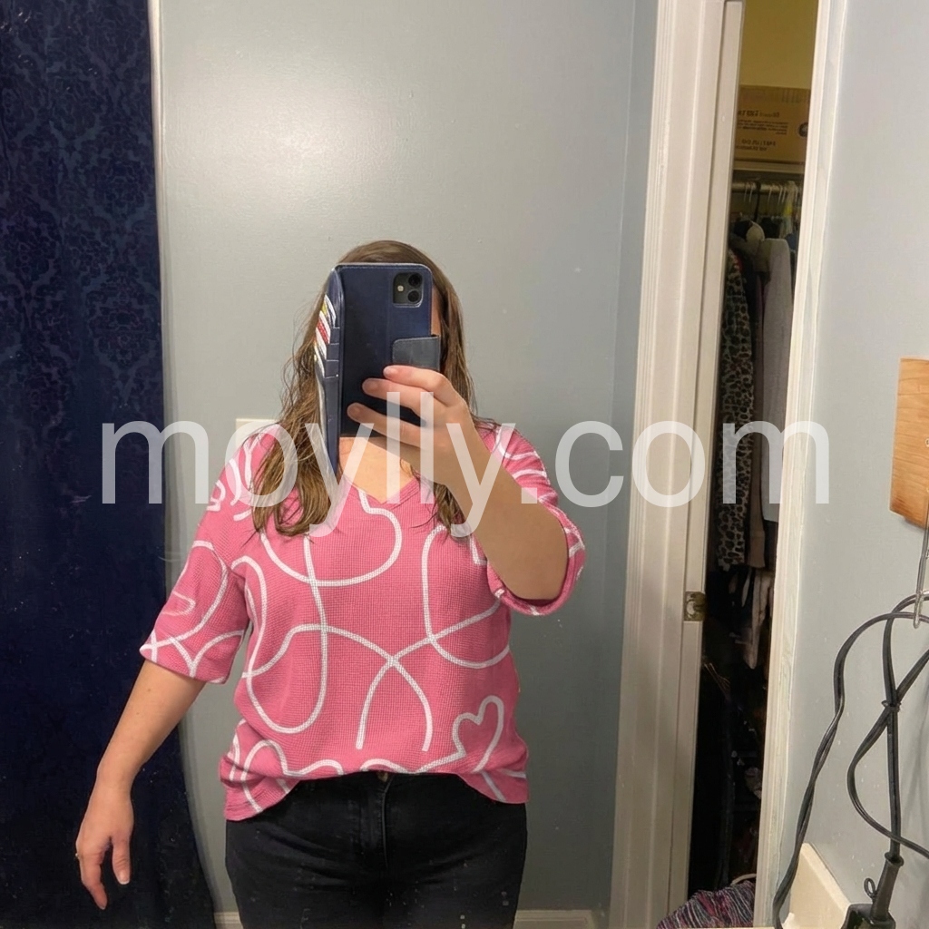 Elevate your casual wardrobe with this refined V-neck top, featuring a delicate heart outline design in soft pink. The flattering V-neckline creates a sophisticated silhouette while the minimalist graphic adds a touch of understated elegance. Crafted for versatility, this piece transitions seamlessly from day to evening, pairing effortlessly with jeans, skirts, or tailored trousers. The gentle pink hue complements a wide range of skin tones and coordinates with most color palettes. Perfect for those who appreciate subtle style details and quality basics that work harder in any wardrobe.
