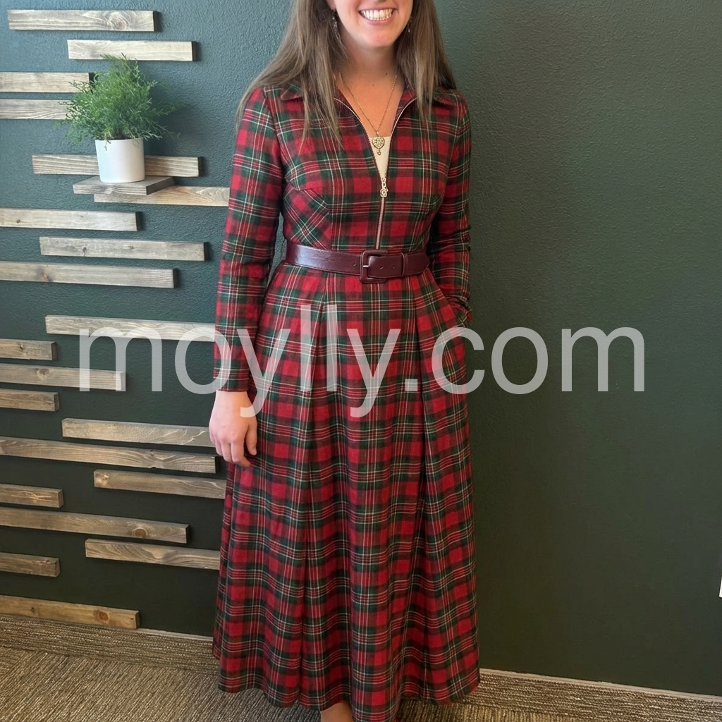 Distinctive Red Plaid Zip Front Long Sleeve Maxi Dress