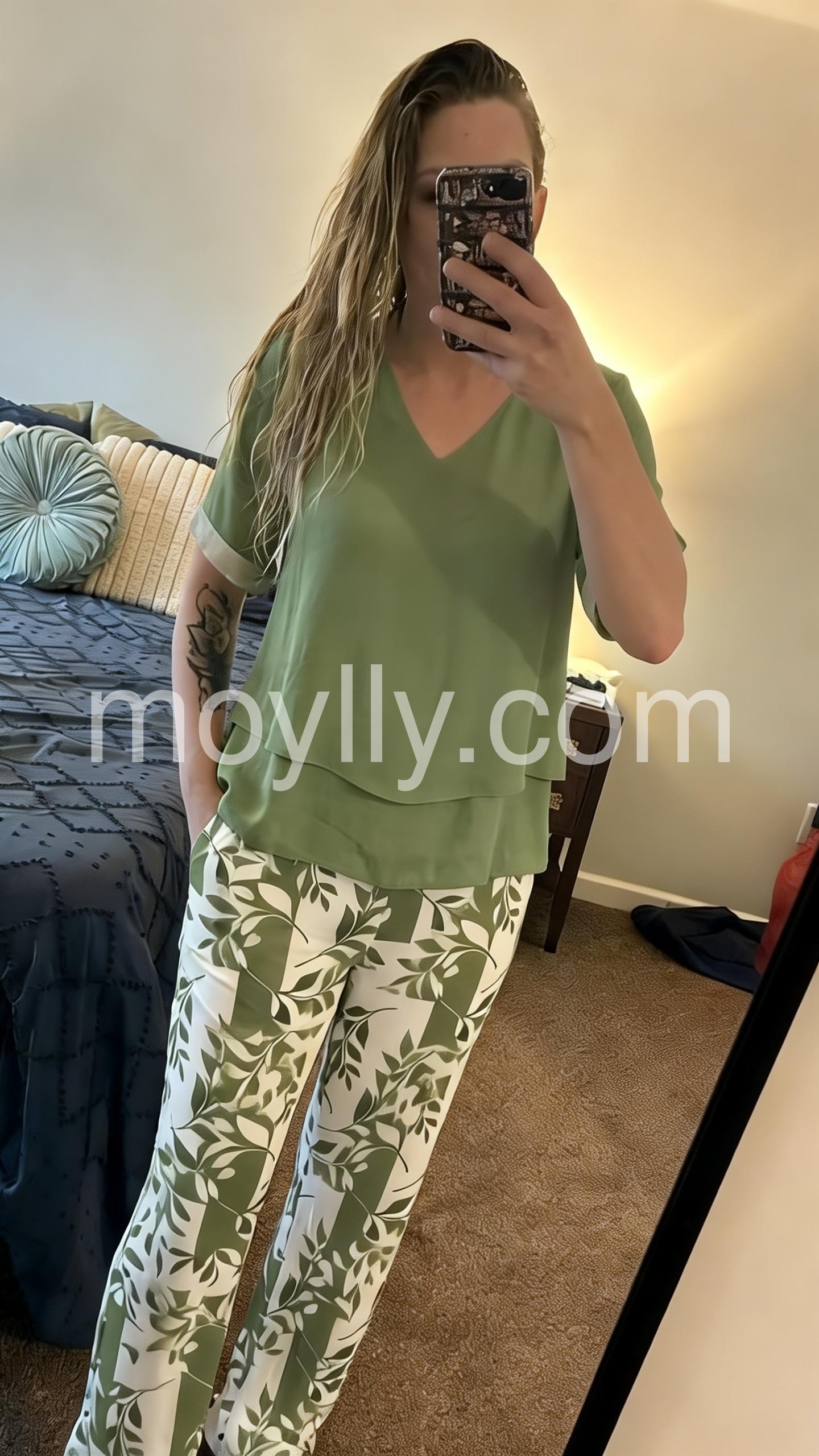 Beautiful sage green color! The outfit looks exactly like the picture. You can easily wear the top with jeans or the pants with a plain white tee. Great value for a two-piece set.