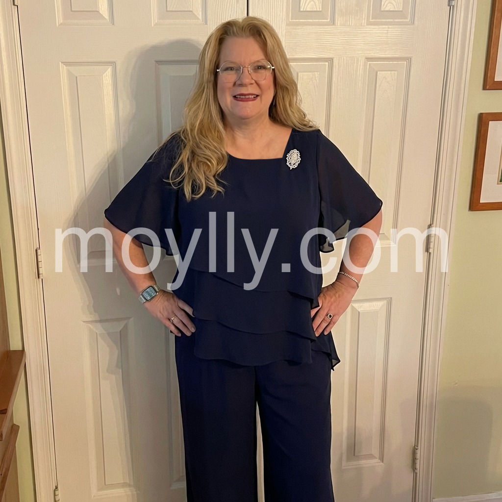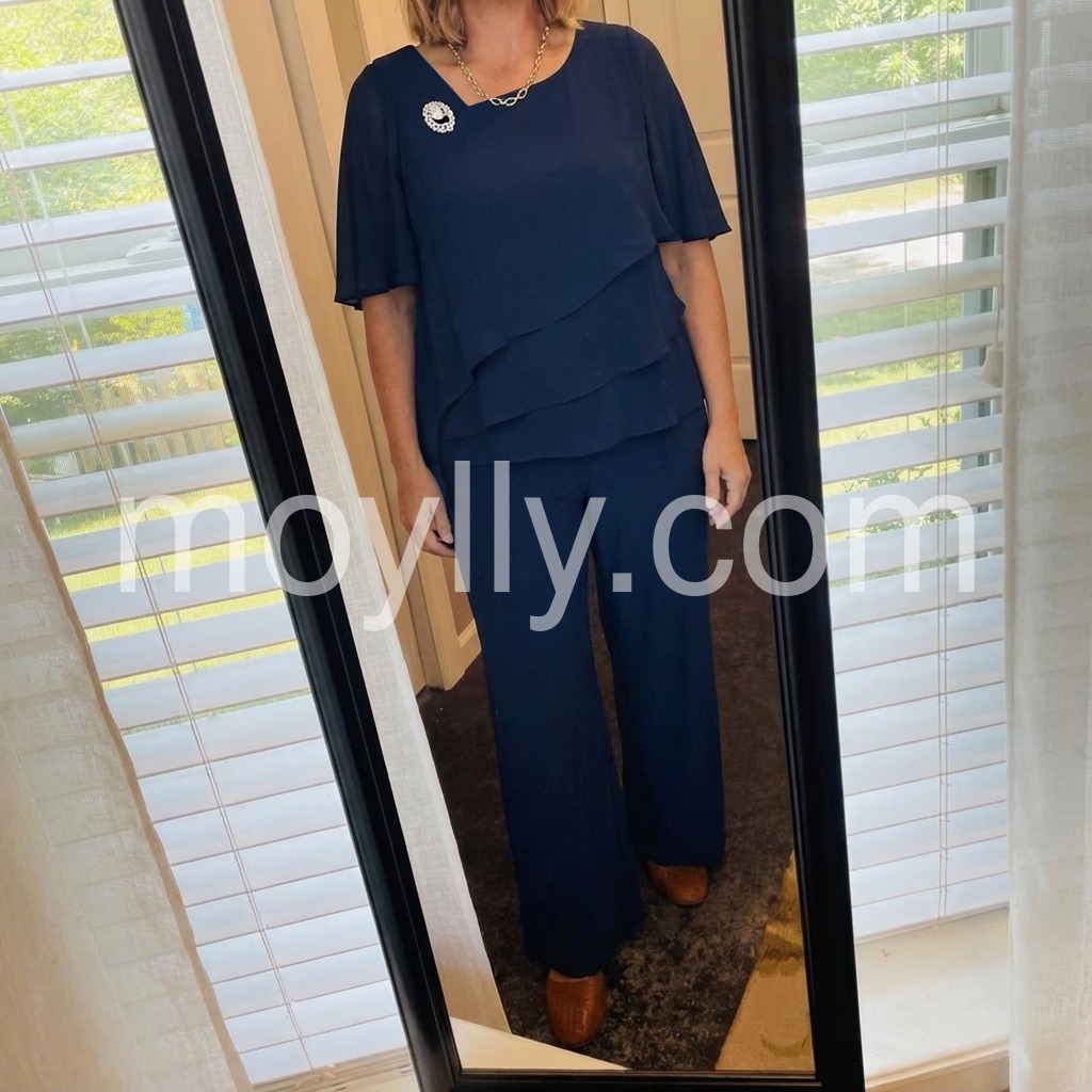 This outfit is a lifesaver. I am not a dress person, so finding something formal enough for an evening gala was stressing me out. This pant suit looks just as dressy as a gown. The navy color is deep and rich. It fits true to size and the chiffon overlay is gorgeous.