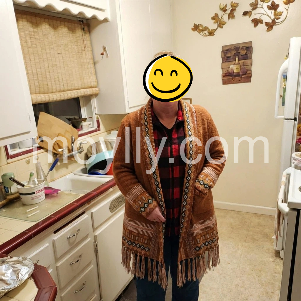 I wasn’t sure about the color online, but in person it’s even better—rich, earthy, and easy to match. The pattern looks crisp, and the knit texture feels comfortable against my skin. I also love the long sleeves and the fringe detail; it makes the cardigan look styled rather than just thrown on. I’ve worn it to brunch and on weekend errands, and it keeps me feeling cozy without overheating. The fit is flattering and gives a nice loose silhouette. I’m very happy with this purchase.