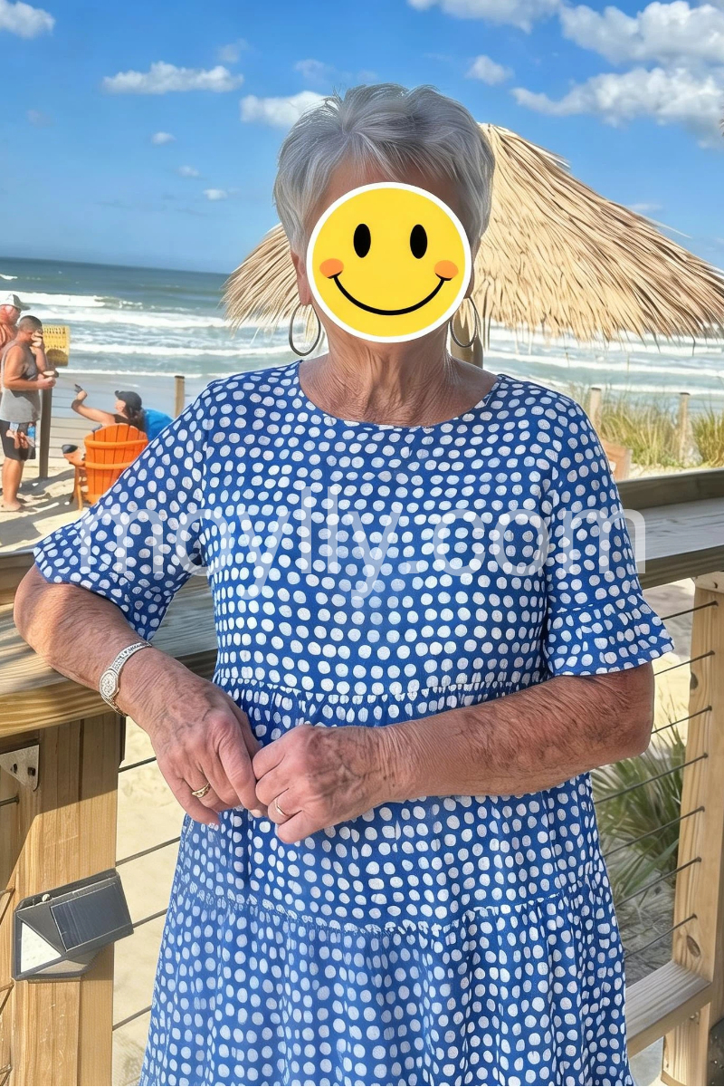 I love how effortless this dress looks while still feeling stylish. The fabric is light and breathable, and the relaxed cut is flattering in all the right ways—it skims my body instead of clinging. The blue-and-white dotted print is so classic. With a straw bag and simple sandals, it’s the perfect outfit for a getaway or a sunny day out.