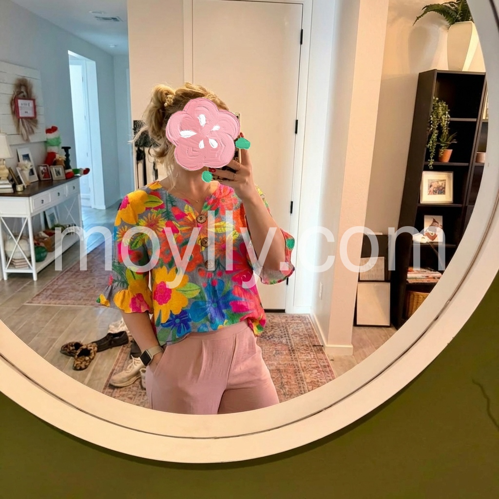 Such a fun and colorful top! The pattern is beautiful and the little flare at the end of the sleeves is adorable. It is casual enough for running errands but can easily be dressed up with nice pants for the office. Will be buying more colors!