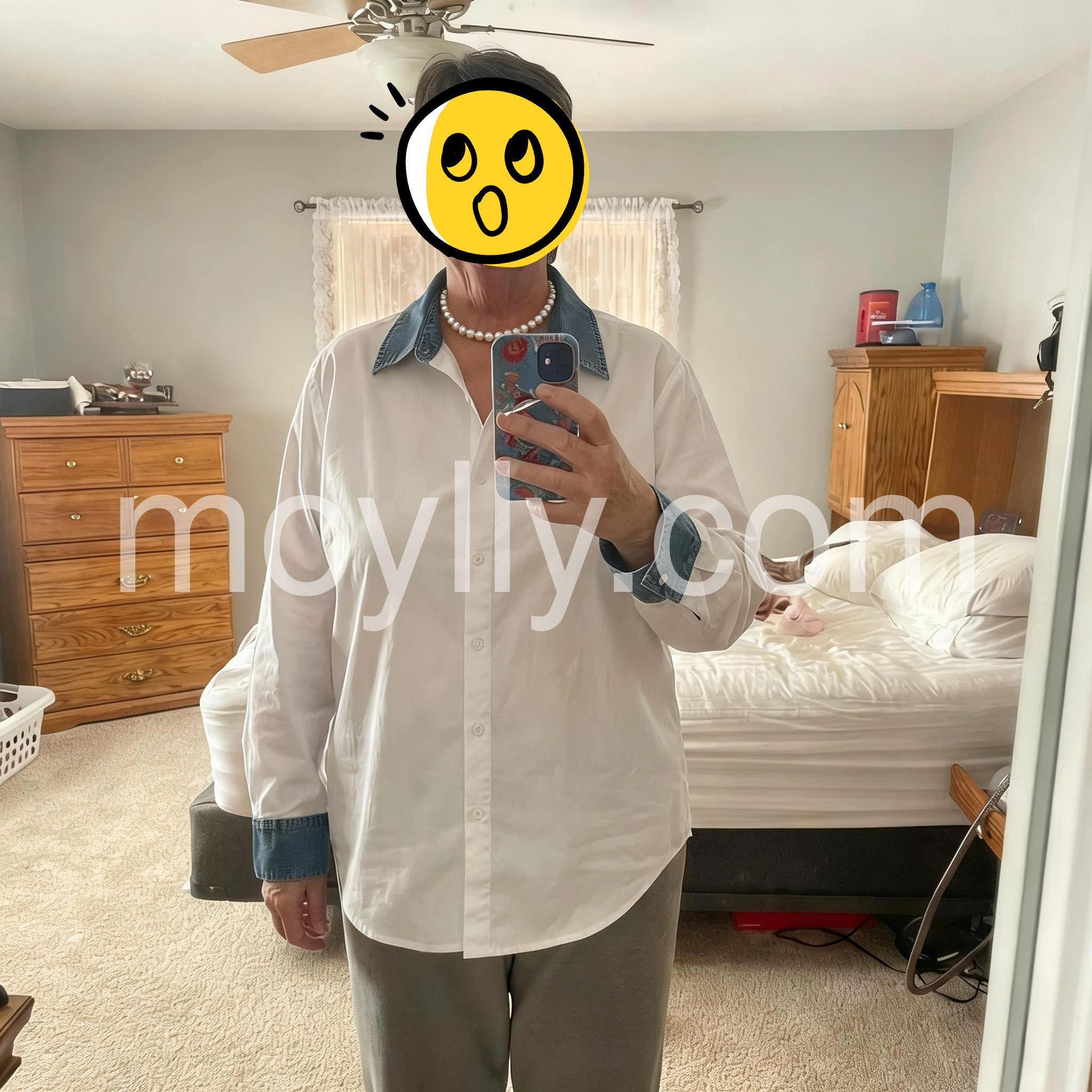 I received this shirt and immediately tried it on—now it’s become one of my go-to pieces. The denim collar adds a trendy touch while the white color stays classic and versatile. It’s soft, comfortable, and the fit looks great for both casual and slightly dressed-up occasions. I wore it to brunch and felt confident the whole time. The stitching looks neat, and the shirt feels like it’s made to last. Highly recommend!