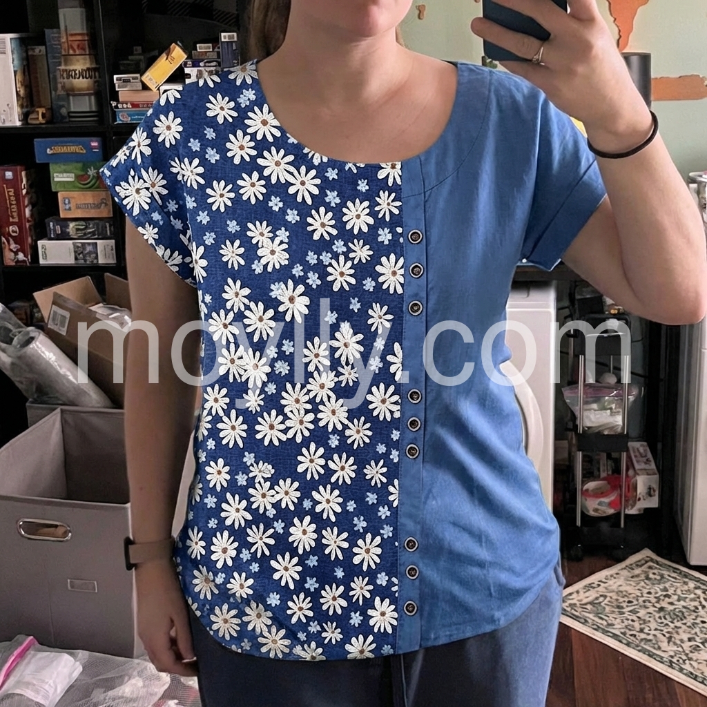 I am absolutely in love with the unique split design of this shirt! The half daisy floral and half solid blue is such a cute contrast. It fits perfectly and looks great with jeans. Highly recommend!