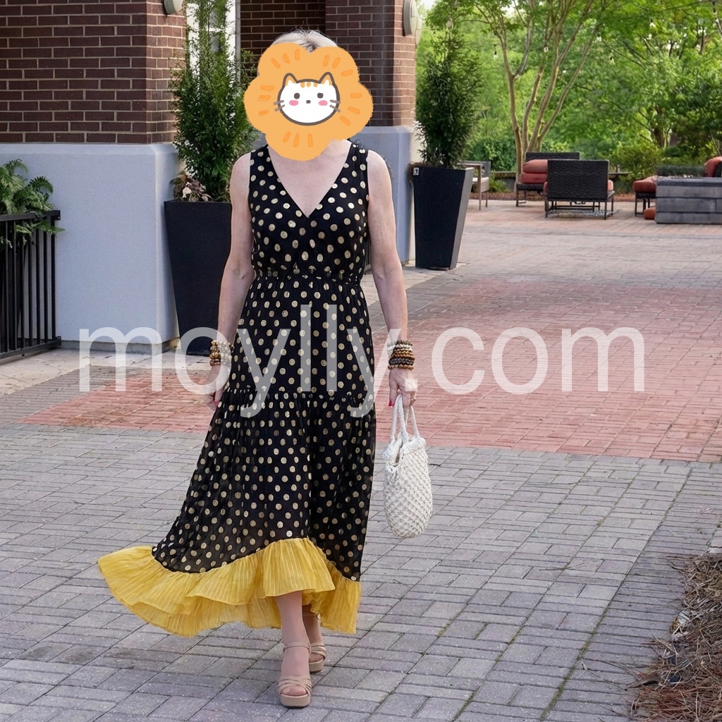 This boho maxi dress is chef’s kiss for summer! The black and gold polka dots are so chic, and that yellow ruffle hem? Chef’s kiss.