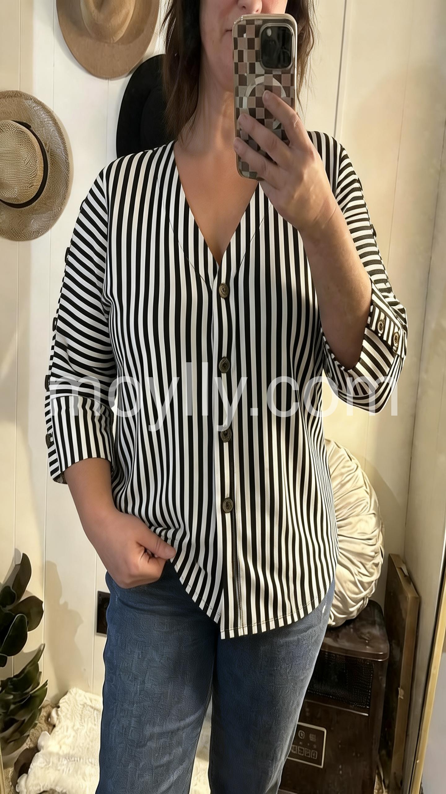 This button-down blouse features bold vertical stripes and a flattering V-neckline. Three-quarter sleeves with buttoned cuffs add a polished touch. Lightweight fabric perfect for casual or office wear. Ideal for pairing with jeans or trousers. Timeless style with modern flair.