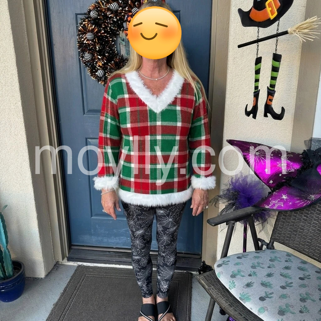 Absolutely adore this festive top! The red and green plaid is so cheerful, and the white fur trim adds a luxurious, cozy feel. The V-neckline is flattering and the long sleeves keep me warm. It’s lightweight enough to layer under a jacket, but cute enough to wear on its own. I’ll be wearing this all holiday season long!
