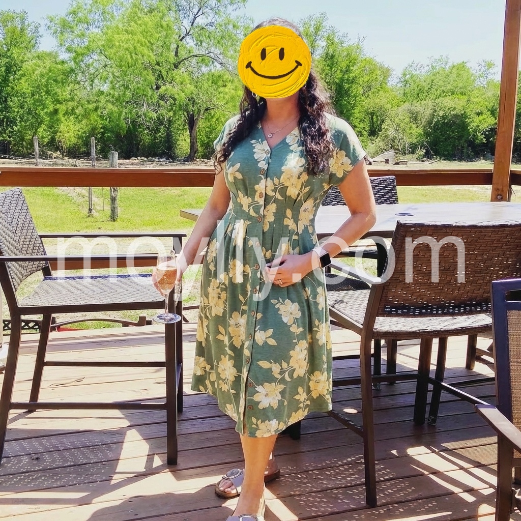 I absolutely love this dress! The green color with yellow flowers is so pretty in person. It fits true to size and the cinched waist is very flattering. Wore it to a brunch and got so many compliments.
