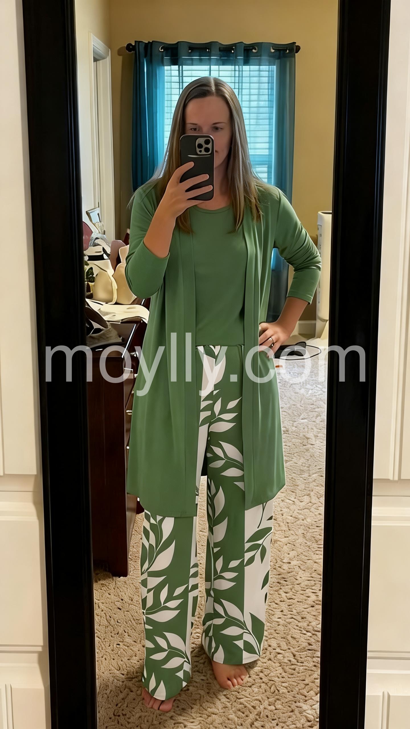 As a woman in her 50s, I struggle to find outfits that are stylish yet forgiving. This set hits the mark perfectly. The drape of the top is very flattering and the pants have an elastic waist that is super comfy. Will be buying in another color if available!