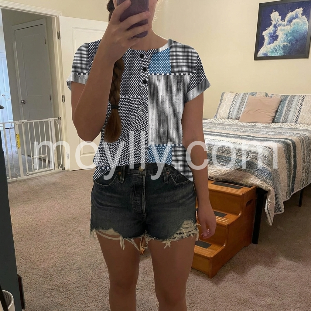 I absolutely love the patchwork design on this top! It is so unique with the mix of stripes and polka dots. The fit is true to size and very flattering. Perfect for casual Fridays at work or a weekend outing.