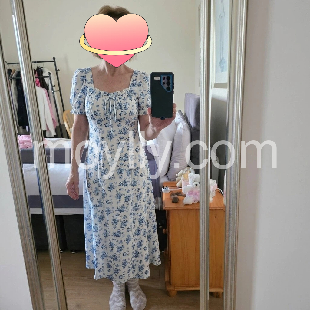 This dress is so pretty! The blue floral print is delicate and looks exactly like the photos. The puff sleeves are cute and make it feel more special. The fabric hangs nicely and the length is perfect for a comfortable midi fit. Overall, it’s well-made, fits well, and is a great purchase.