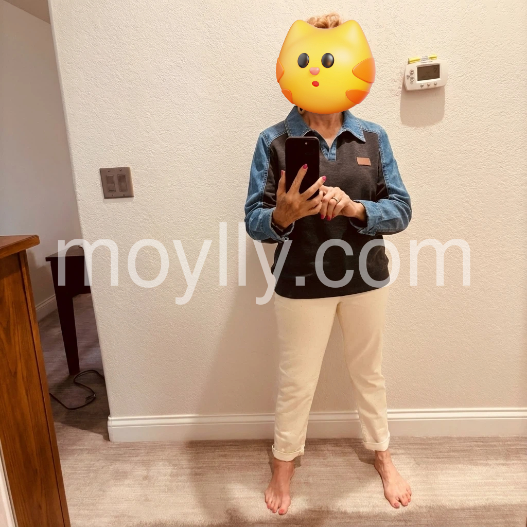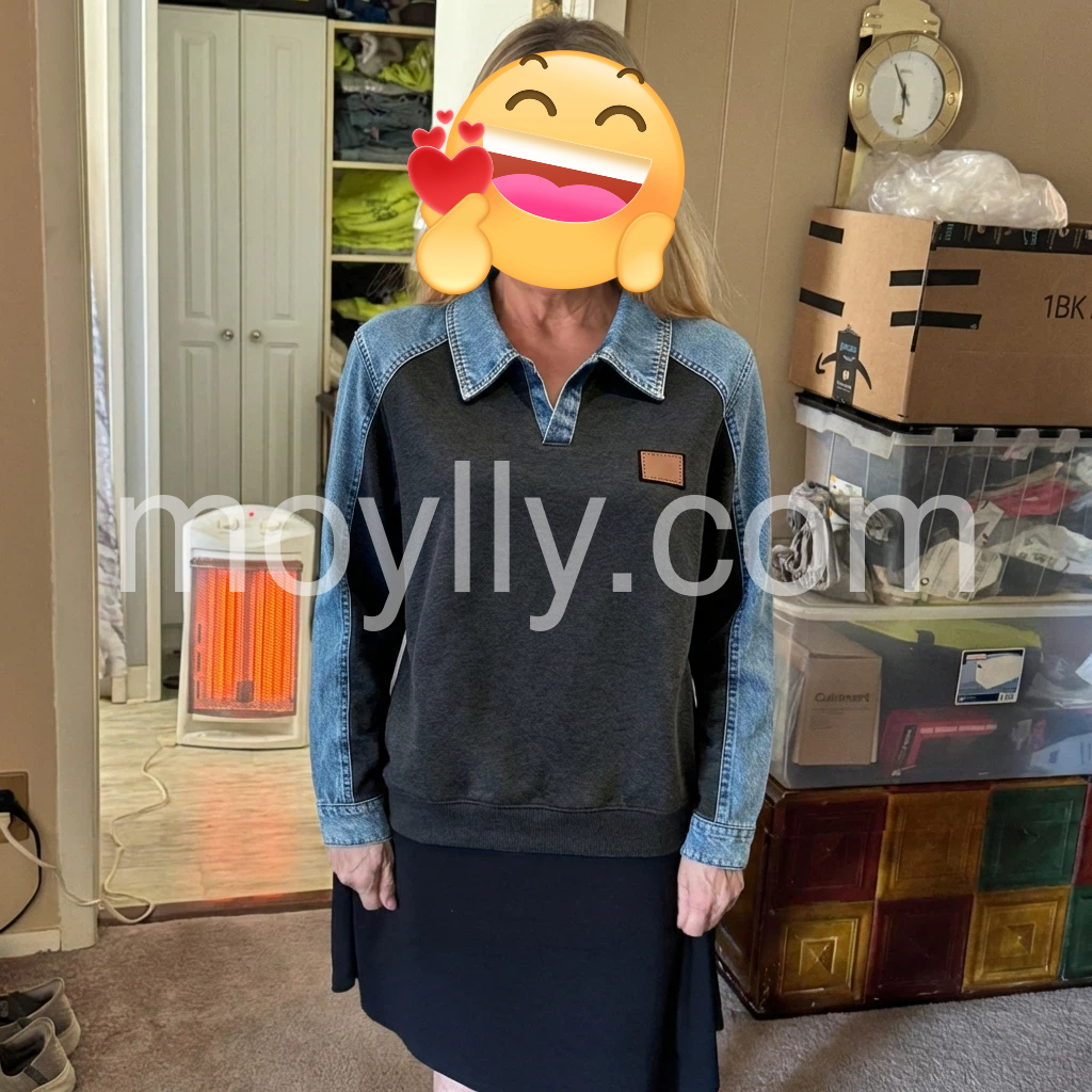 This shirt surprised me in the best way. The denim collar gives it a trendy, slightly edgy look, while the overall top is cozy and easy to wear. The fit is flattering without being tight, and the neckline feels secure—no awkward gaping or shifting as I move around. I also like the patch detail; it adds a quality touch that makes the whole piece look more expensive. I’ve worn it to brunch and also on a weekday errands day, and it works for both. After a wash, it stayed looking neat and the fabric didn’t pill.