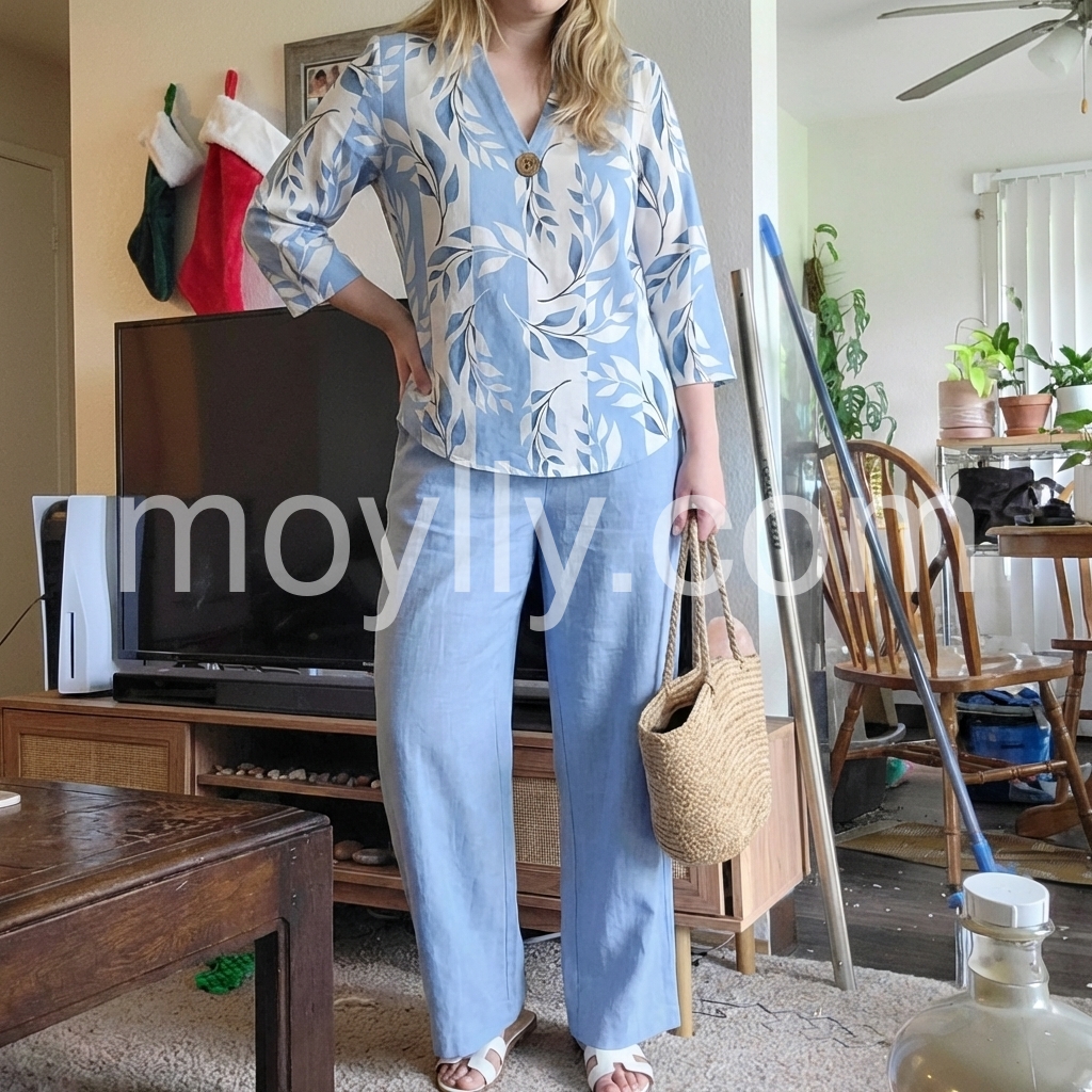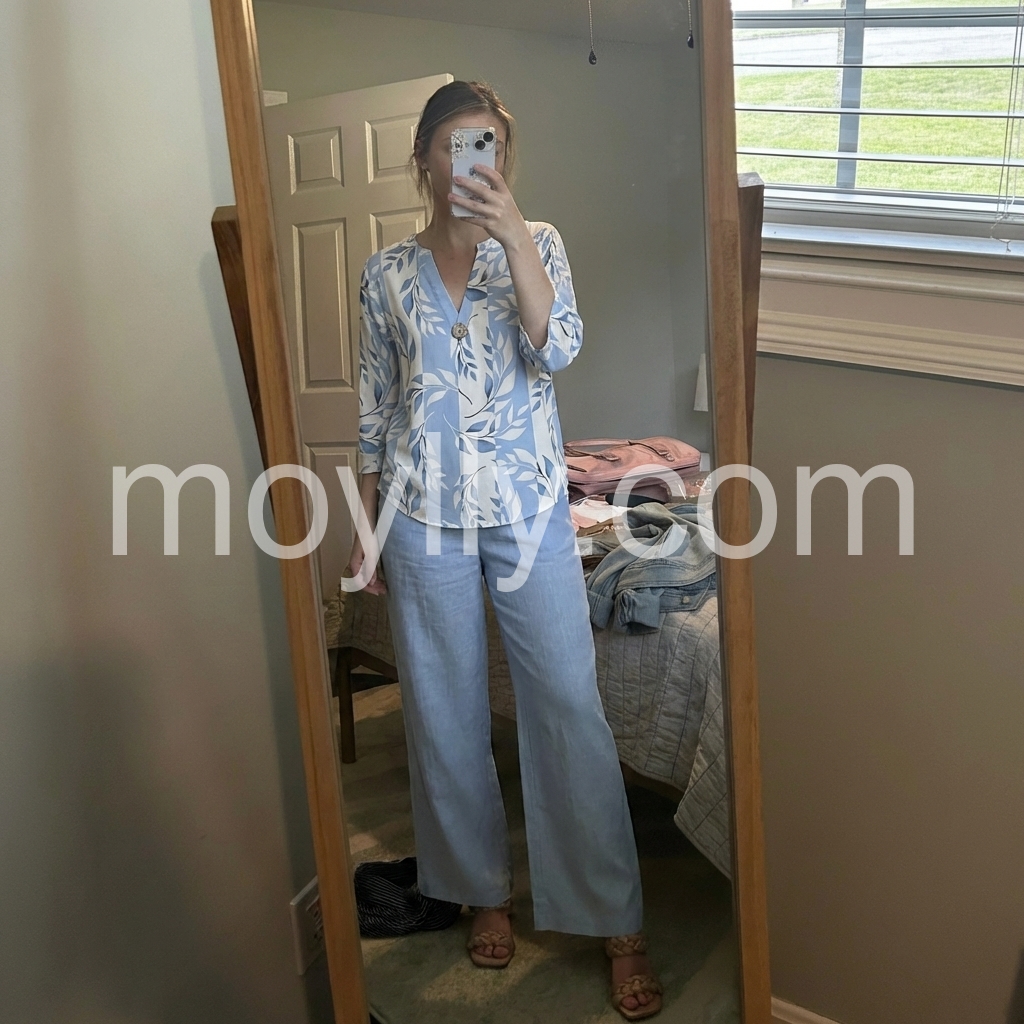 I bought these pants for an upcoming vacation, and I'm so glad I did. They are lightweight, comfortable, and the light blue shade is beautiful. They pair perfectly with the matching top.