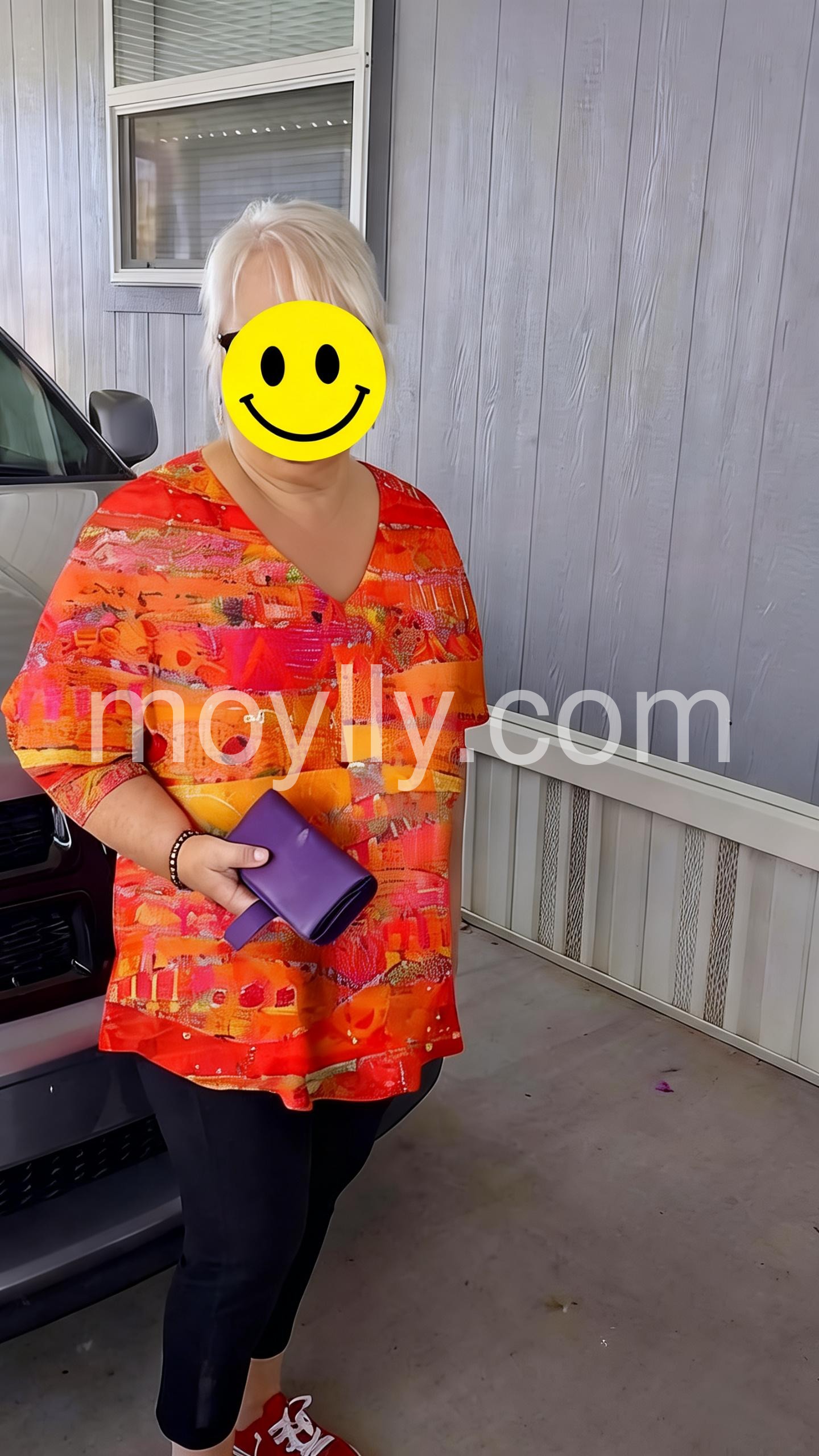 As a curvy woman I find this top incredibly flattering. It hides my tummy and the warm colors brighten up my complexion.