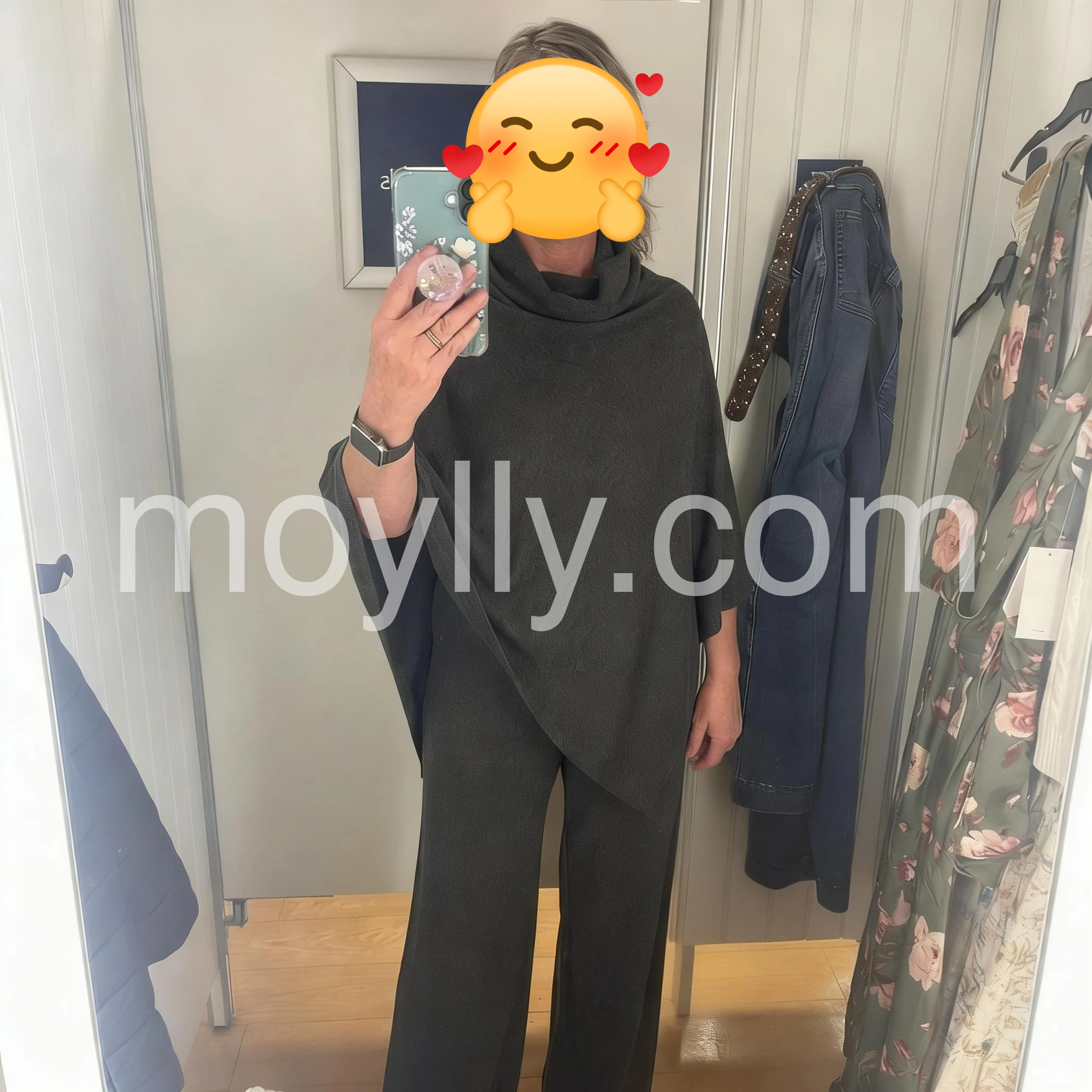 This two-piece set is the epitome of effortless elegance! The soft, drapey fabric feels luxurious against the skin, and the deep charcoal gray color is timeless and sophisticated. The cowl-neck poncho top is so cozy and chic, with its asymmetrical hem adding a modern touch, while the wide-leg pants are flowy and comfortable, perfect for both casual outings and formal events. I feel so polished and put-together every time I wear it!