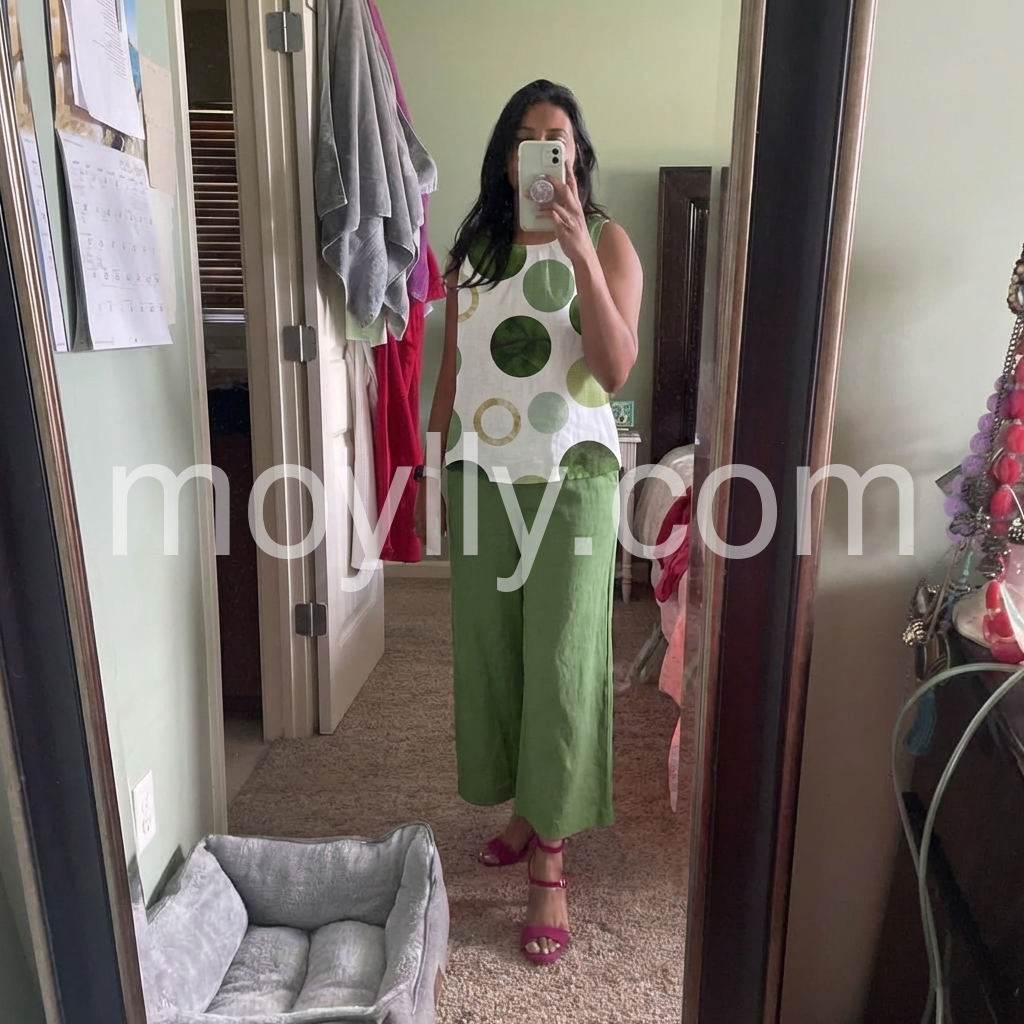 I absolutely love this two-piece set! The green polka dot pattern on the top is so fun and vibrant, and the wide-leg pants are incredibly comfortable. Perfect for a summer vacation or a casual brunch. The material is lightweight and breathable. Highly recommend!