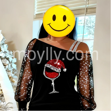This elegant long-sleeved holiday Christmas shirt features a glittering print of a tipsy red wine glass with a Santa Claus hat, spreading the holiday cheer with a super-fun vibe, ready for par-tay good times! This black off-shoulder asymmetrical shirt features sheer long sleeves elevating this top to a luxe look for any date night. Machine wash cold tumble dry low to medium heat. Iron if needed or lay flat to dry.