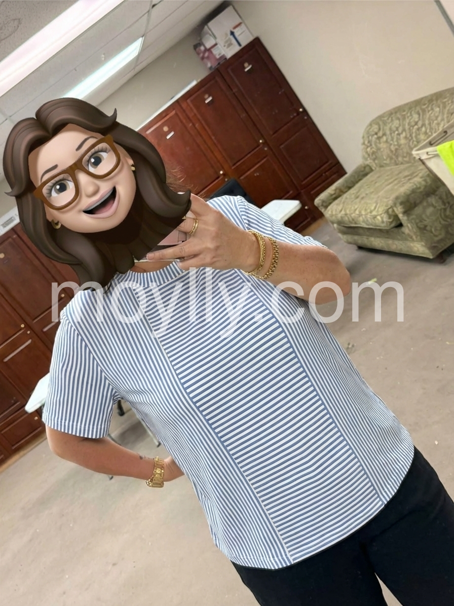 I love the unique mix of horizontal and vertical stripes on this shirt! It is so flattering and adds a fun twist to a classic blue and white striped tee. Fits true to size.