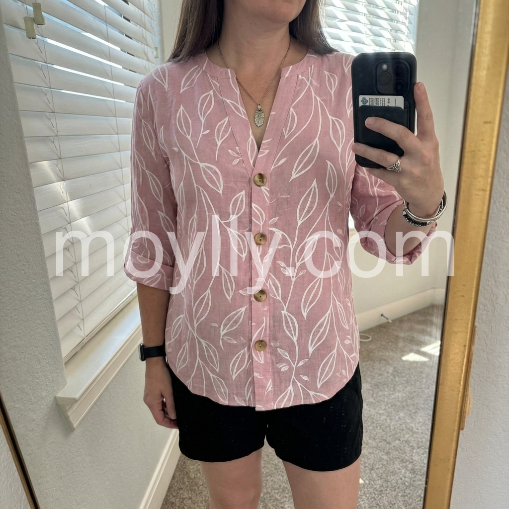 I absolutely love this top! The dusty pink color is so flattering, and the white leaf pattern gives it a fun, tropical vibe. It fits true to size and is incredibly comfortable for hot summer days. I wore it with white denim shorts just like the model, and got so many compliments.