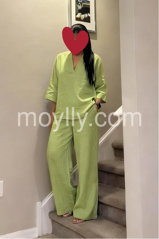 I loved this set the color is beautiful, the fabric feels amazing, and the pants have the perfect length. It barely wrinkles, it’s not see-through at all, and it feels very durable. It looks super stylish and honestly, it’s one of my best purchases. I absolutely loved it.