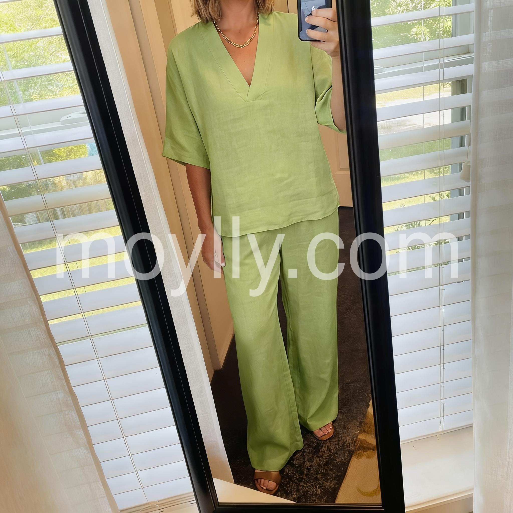 I absolutely love this set! The material feels like a high-quality linen blend and is incredibly breathable. Perfect for my upcoming beach vacation. The green color is vibrant but still earthy. Highly recommend!