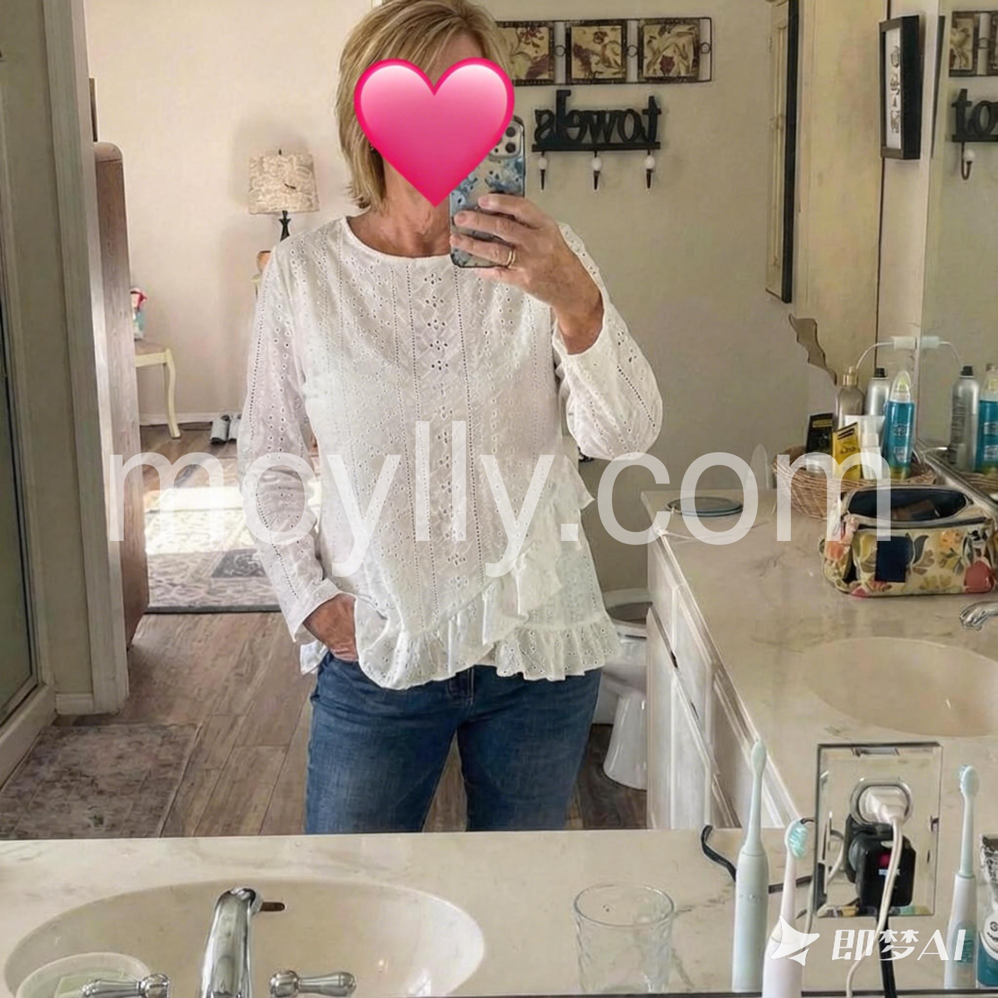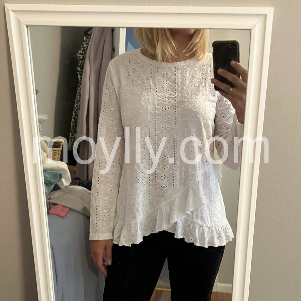 My new favorite white shirt! It elevates a simple outfit instantly. The delicate ruffles and intricate cutouts make it stand out from basic tops.