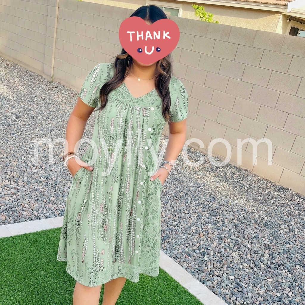 Absolutely love this dress! The light green color is perfect for spring and summer. The material is so soft and flowy, making it incredibly comfortable to wear all day. The v-neck is flattering without being too revealing. Highly recommend!