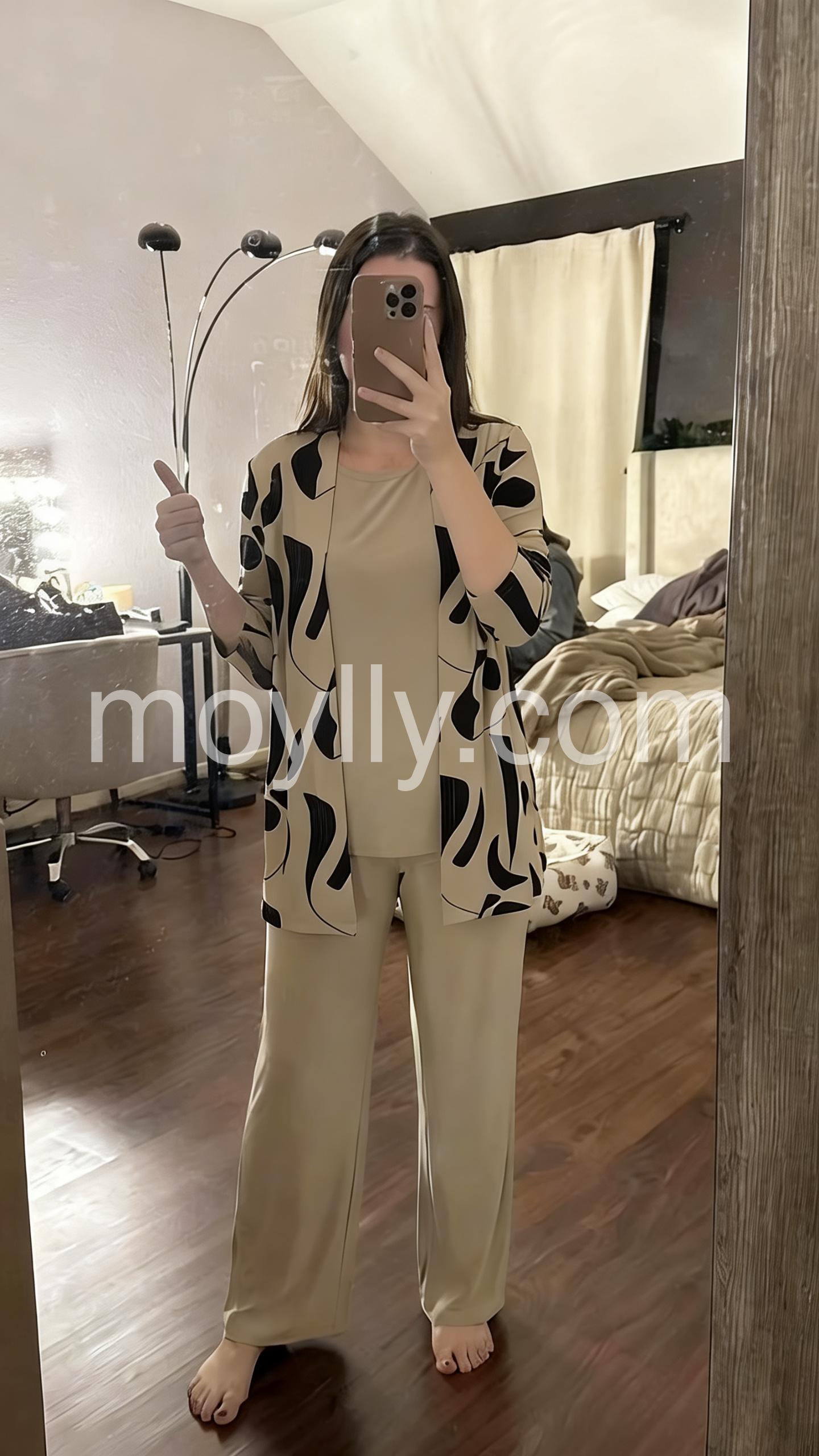 I was hesitant to buy clothing online, but this set exceeded my expectations. The taupe color is stunning and very neutral. The wide leg pants are flowy and do not cling to my thighs. It feels like wearing pajamas but looks incredibly chic for the office.