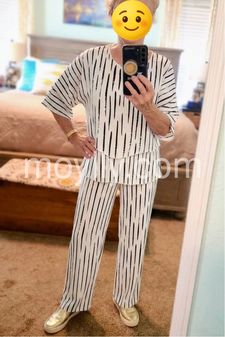 Absolutely love this outfit! You can wear the top and pants together for a striking look, or mix and match them with other items in your closet. The abstract stripes are very slimming. The fabric doesn't wrinkle easily, making it great for travel.